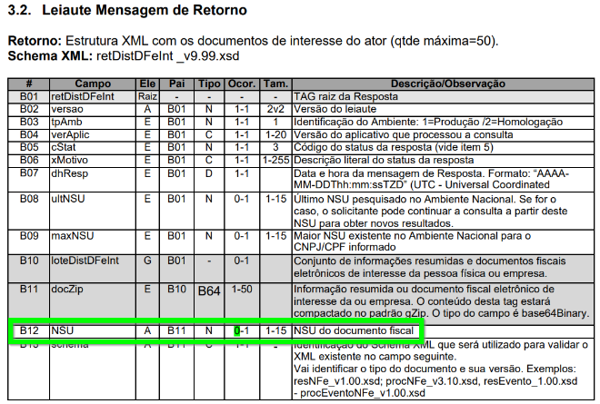 - Campo ultNSU ID A08 passa a ter a seguinte descrição: Último NSU recebido pelo ator. Caso seja informado com zero, ou com um NSU muito antigo, a consulta retornará unicamente as informações resumidas e documentos fiscais eletrônicos que tenham sido recepcionados pelo Ambiente Nacional no máximo nos últimos 3 meses. Ambiente de homologação: 01/11/2021 | Ambiente de produção: 08/11/2021.