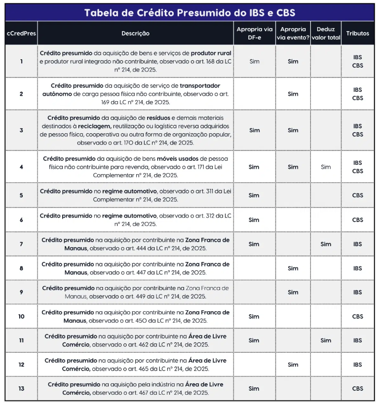 No dia 4 de julho de 2025, a Receita Federal publicou a Tabela de Crédito Presumido do IBS e da CBS, através do Informe Técnico RT 2025.002, que apresenta a Tabela de Código de Classificação Tributária do IBS e da CBS — cClassTrib, e a Tabela de Indicadores do CST e recentemente na versão 1.10 temos alterações onde passa a incluir também a tabela da Classificação do Crédito Presumido – cCredPres, com o objetivo de padronizar, identificar e operacionalizar os créditos presumidos autorizados pela Lei Complementar nº 214/2025.