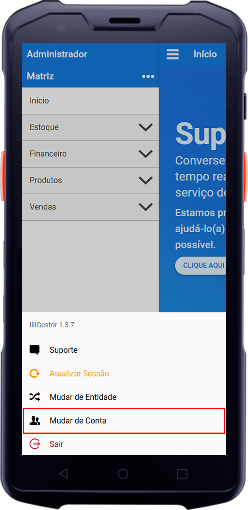 - Mudar de Conta: Este campo possibilita ao usuário trocar a conta de acesso ao illigestor. Isso é útil em situações onde múltiplos usuários compartilham o mesmo dispositivo ou quando é necessário alternar entre contas com diferentes níveis de permissão.