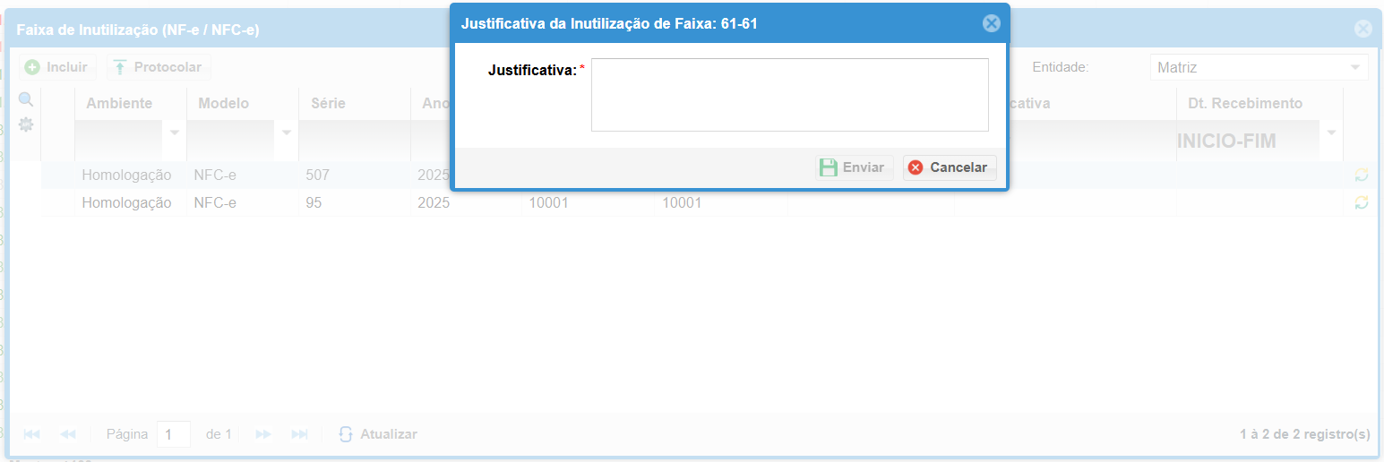 - Na tela de confirmação, revise as informações e clique em Protocolar. Após confirmado, informe uma justificativa e clique em Enviar. As notas fiscais serão inutilizadas e esse processo não pode ser revertido.