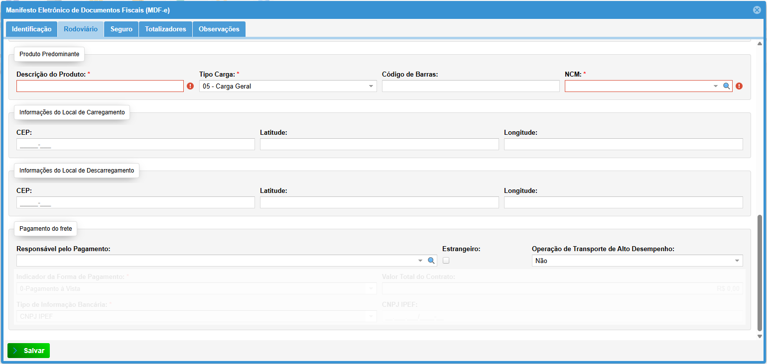 - Valor Carga (R$): Informe o valor total da carga transportada em reais.