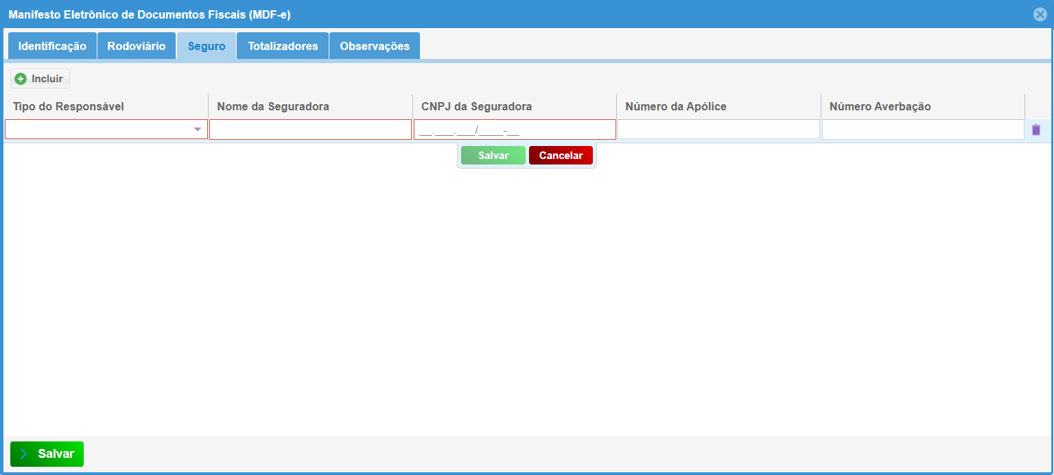 - CNPJ da Seguradora: Informe o CNPJ da seguradora.