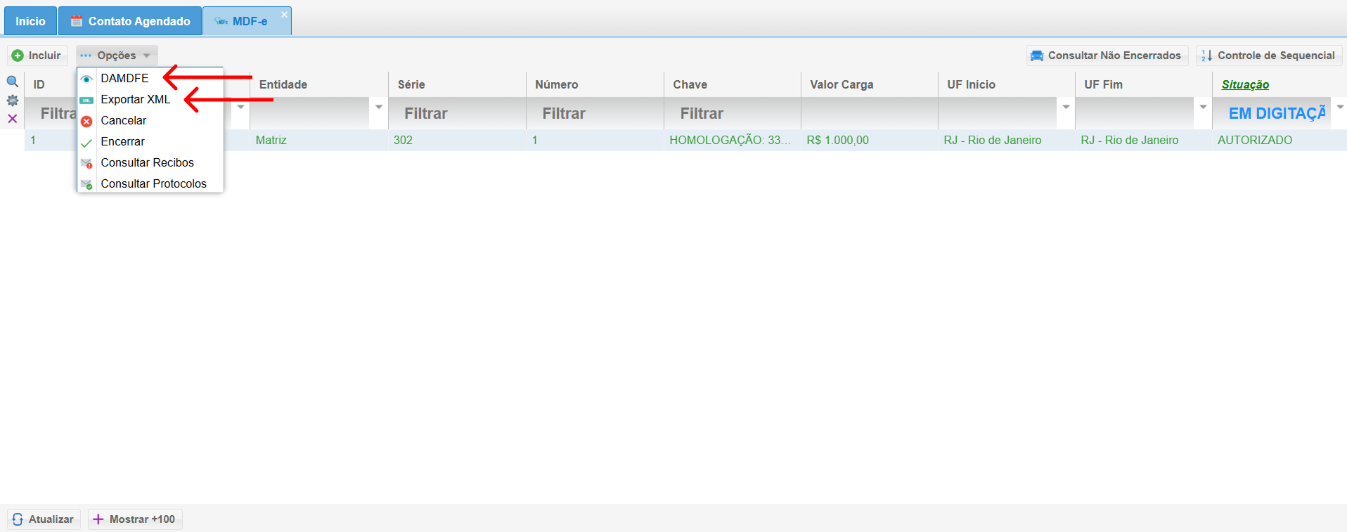 Após a autorização do MDF-e, novas opções ficam disponíveis: