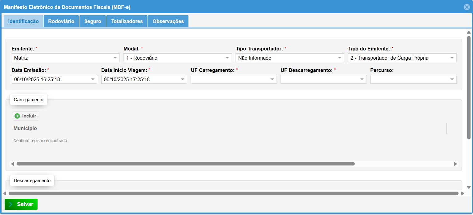 - Carregamento: Inclua o município onde a mercadoria será carregada.