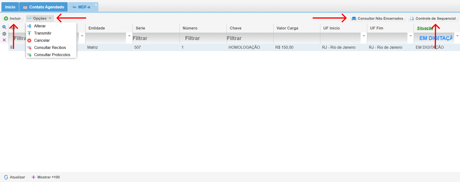 - Alterar: Permite editar um MDF-e já criado, corrigindo erros ou complementando informações, desde que o MDF-e ainda não esteja transmitido para a Receita Federal.