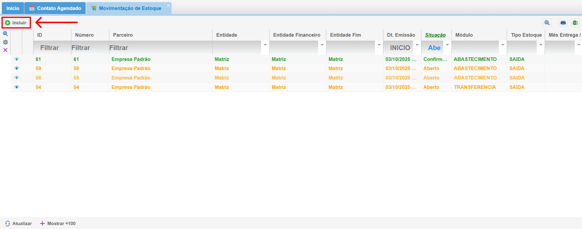 - Clique em Incluir: Para iniciar uma nova movimentação.