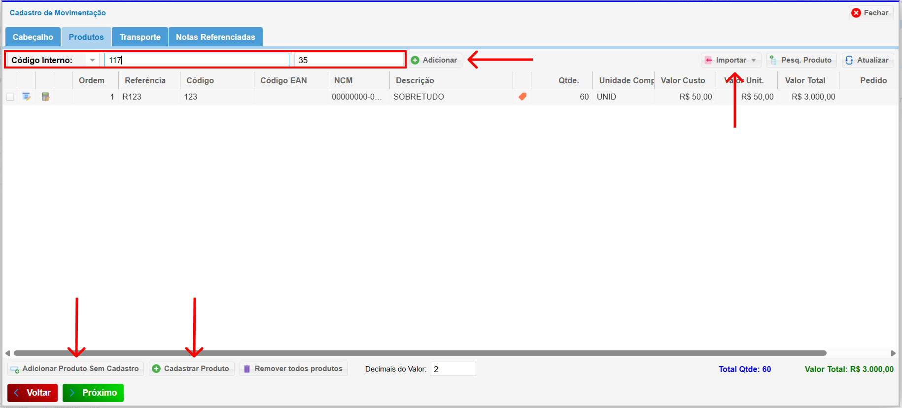 - Adicionar: Após selecionar os produtos, clique em "Adicionar" para adicioná-los à movimentação.