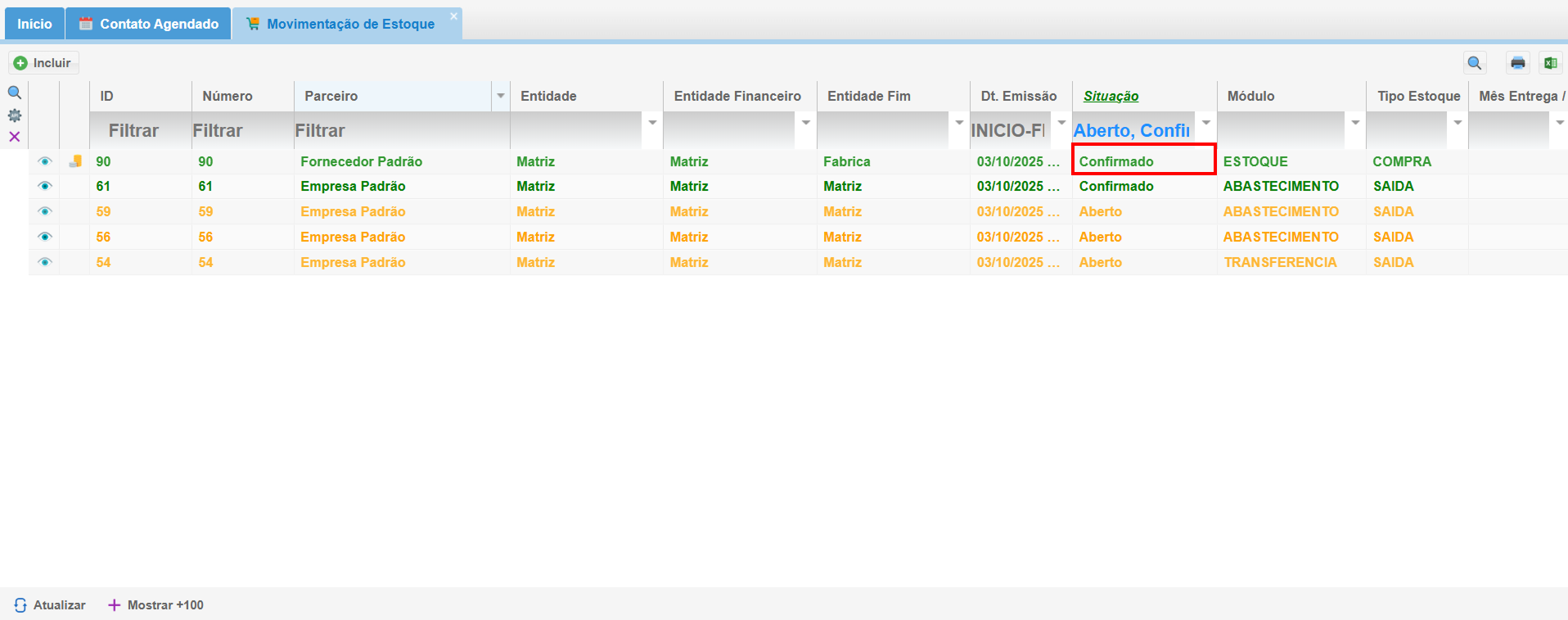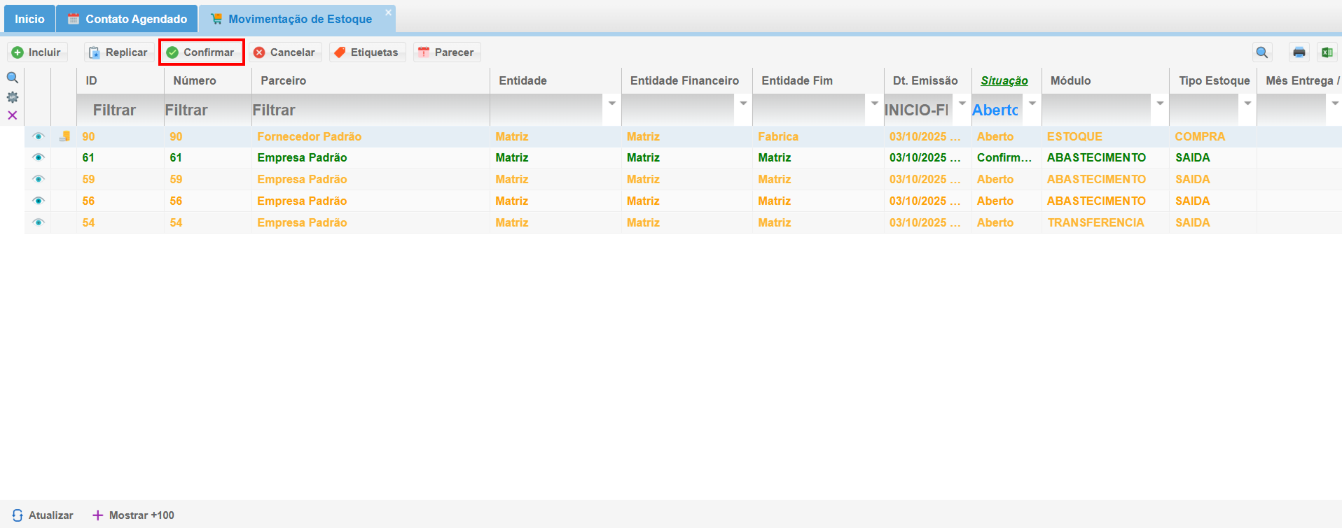- Movimentação Confirmada: Selecione a movimentação com a situação "Confirmado".