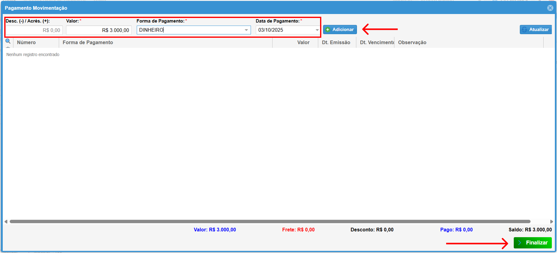 - Confirmar: Confirma a movimentação, exigindo o preenchimento das informações de pagamento (se gerar financeiro).