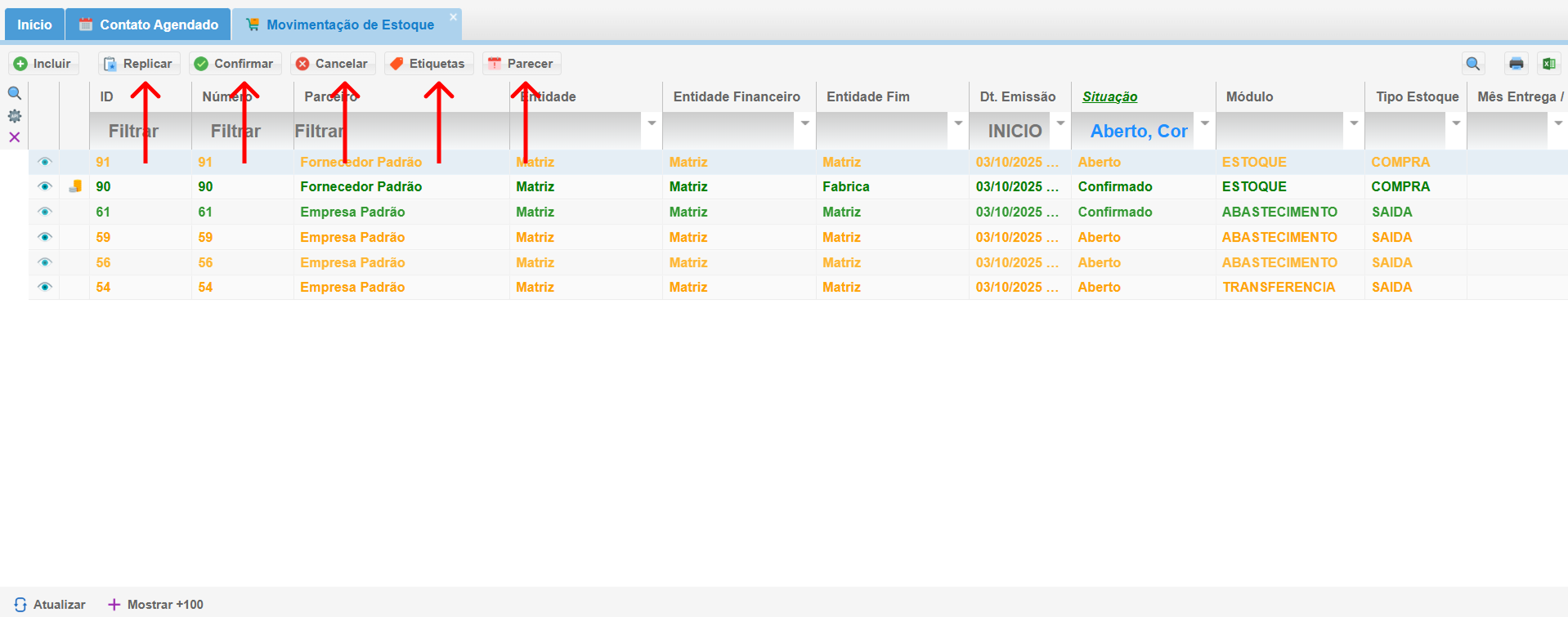 8. Com a movimentação na situação Aberto selecionada, aparecem as opções: