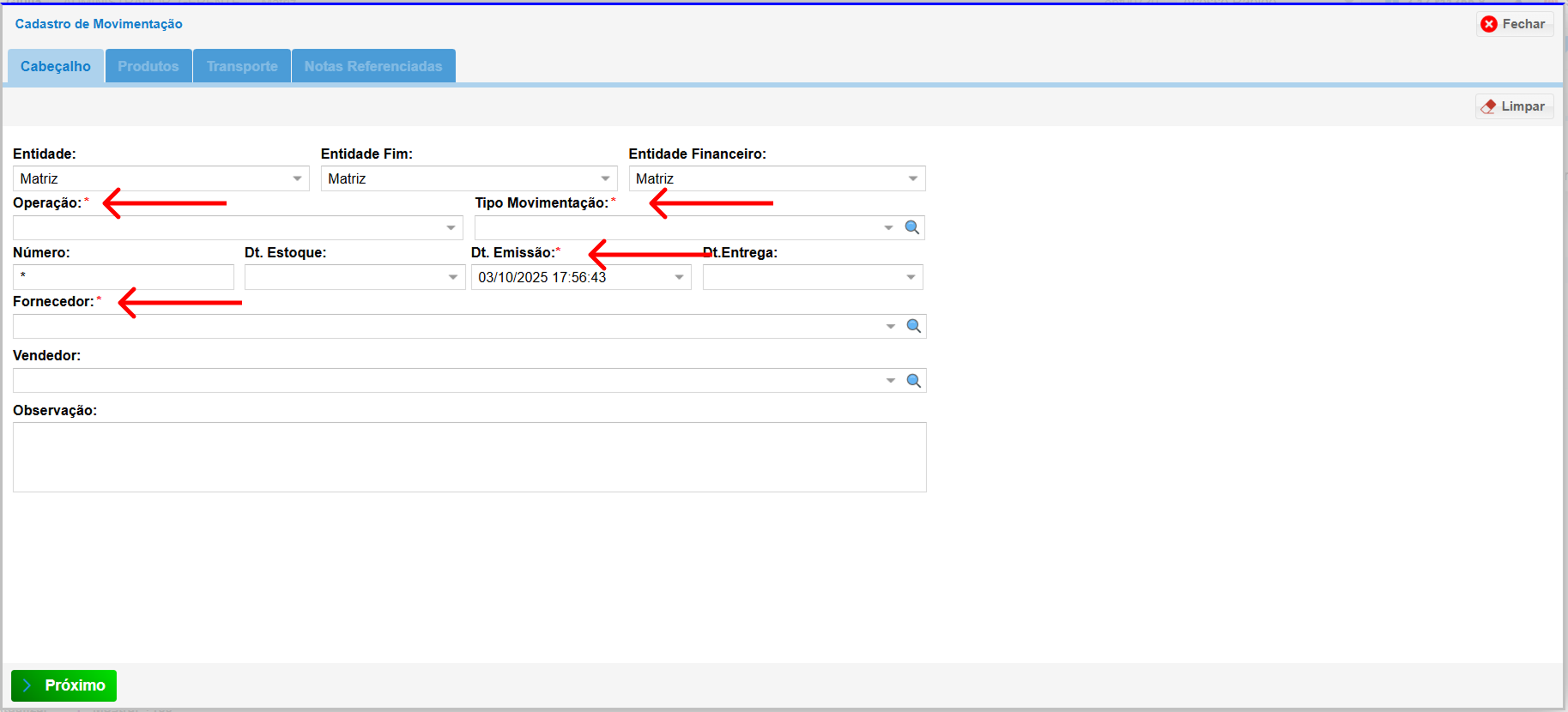- Entidade: Selecione a empresa que está realizando a movimentação (empresa originária).
