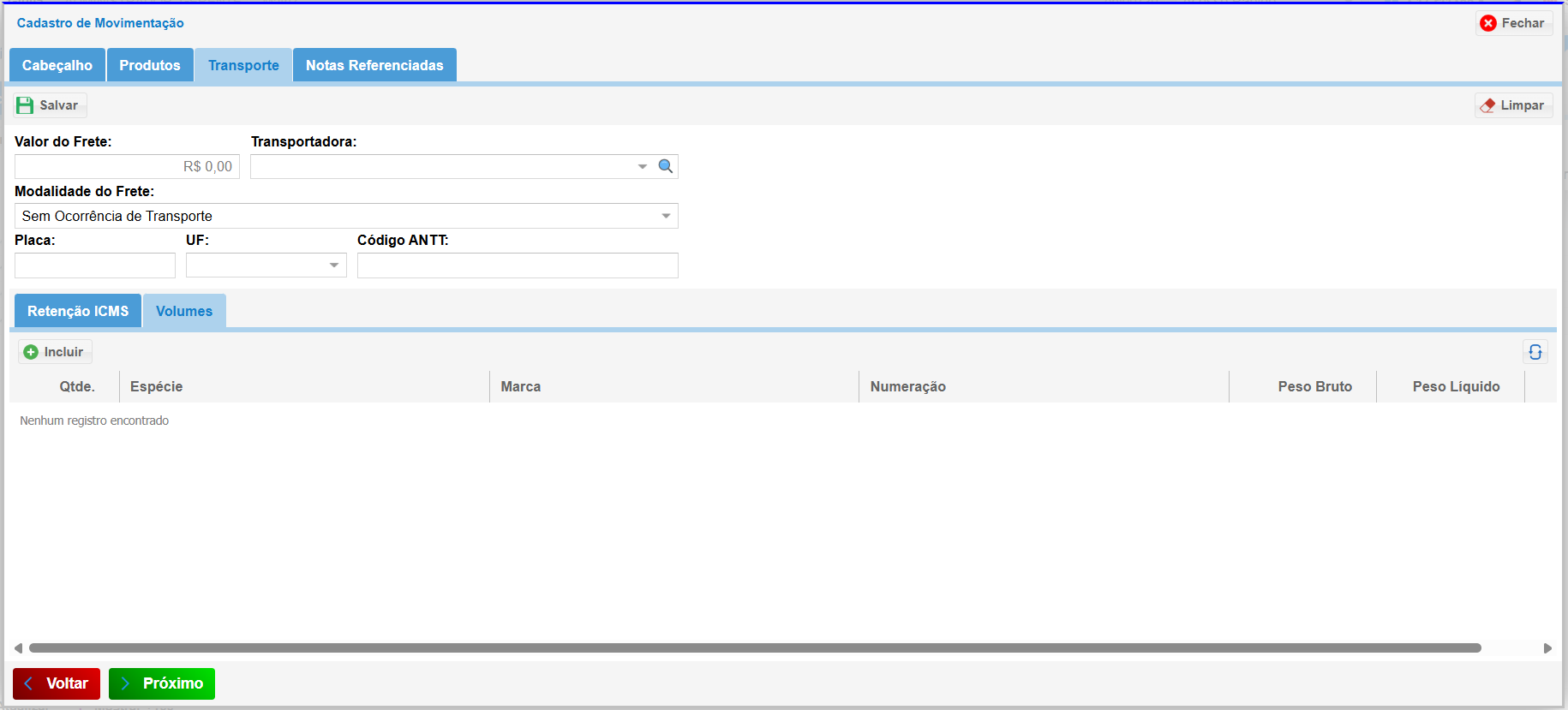 - Aba Transporte: Acesse a aba "Transporte" para inserir as informações da transportadora, se necessário.