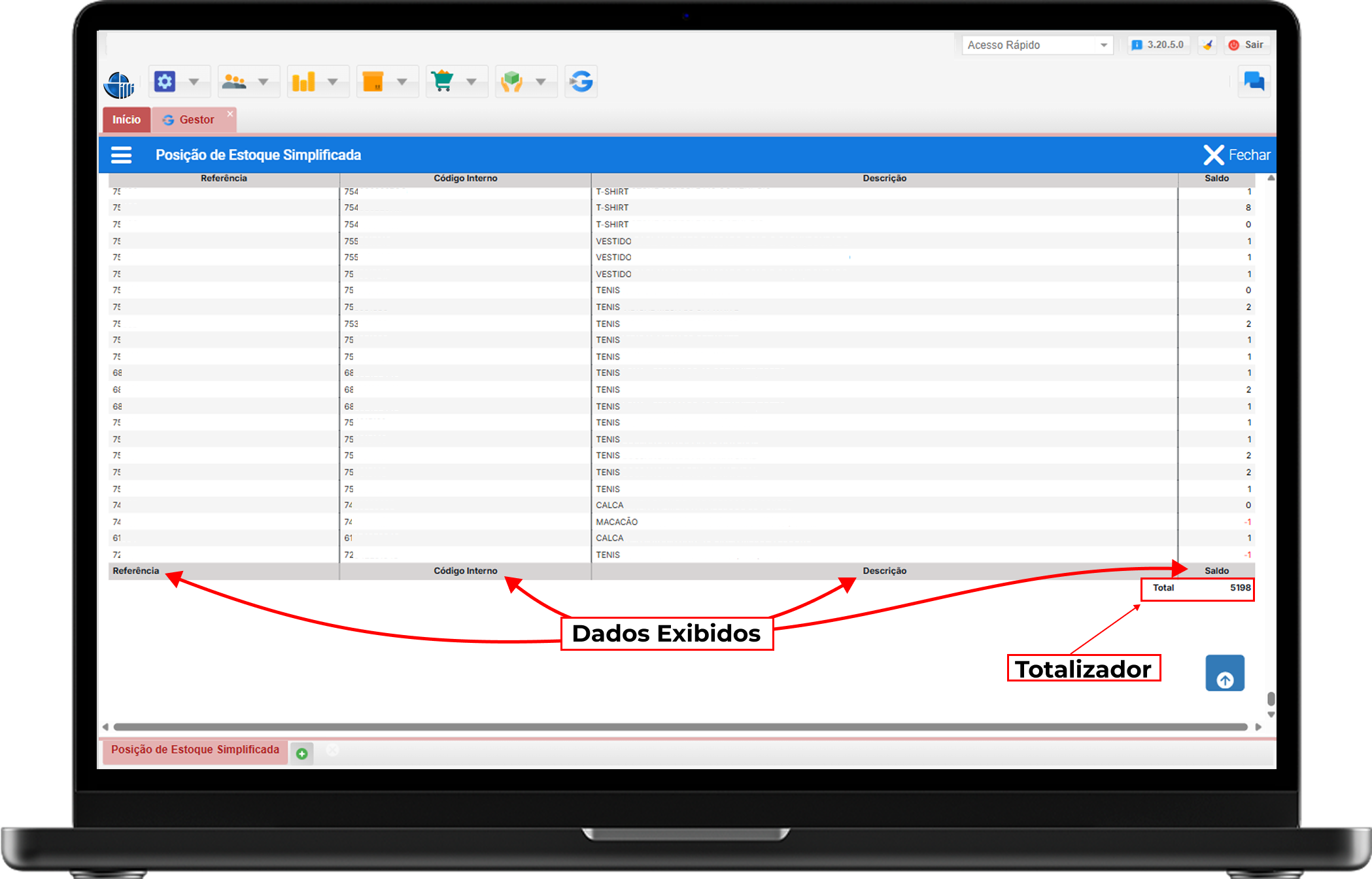 Saldos Negativos: O relatório pode apresentar produtos com estoque negativo. Isso ocorre devido a uma configuração do sistema que permite a realização de vendas mesmo quando o estoque físico é insuficiente ou nulo, geralmente para garantir que a venda não seja perdida.