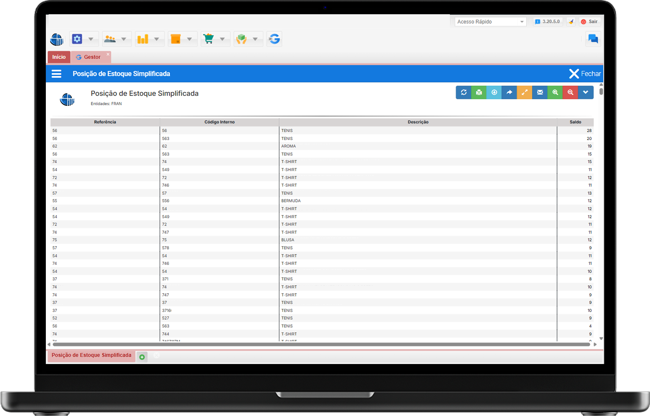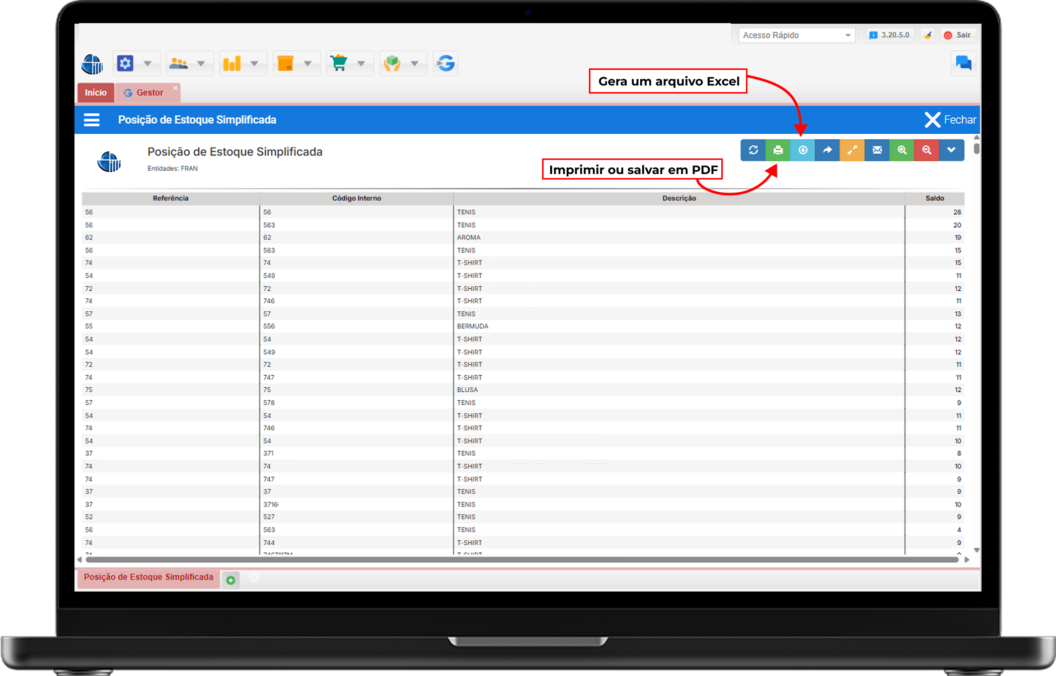 Você pode imprimir ou exportar o relatório para salvar a posição do estoque consultada naquele momento, usando os ícones no canto superior direito da tela.