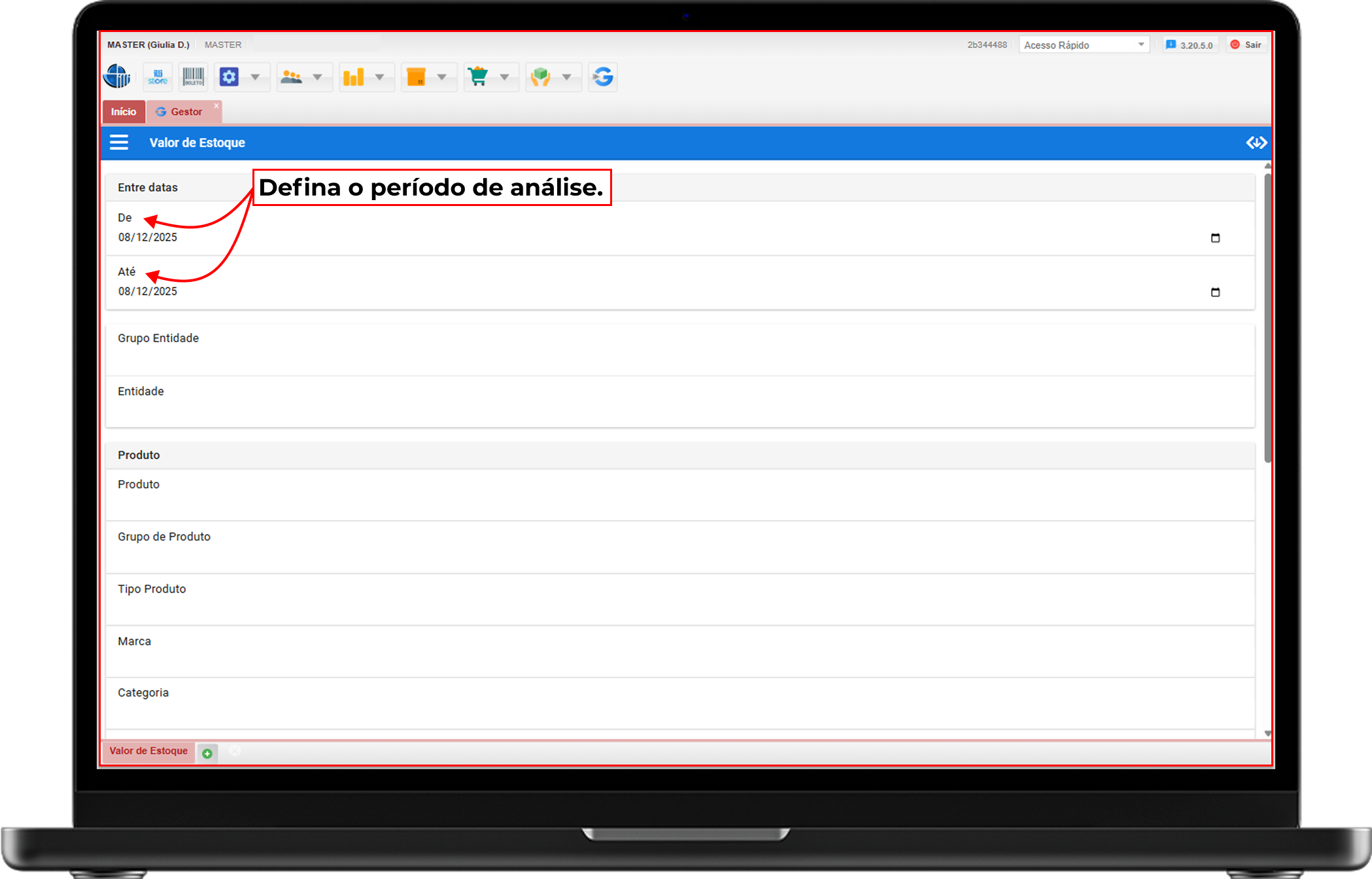 - Detalhe Importante: Selecione a loja desejada para garantir que os dados de estoque sejam restritos a essa unidade.