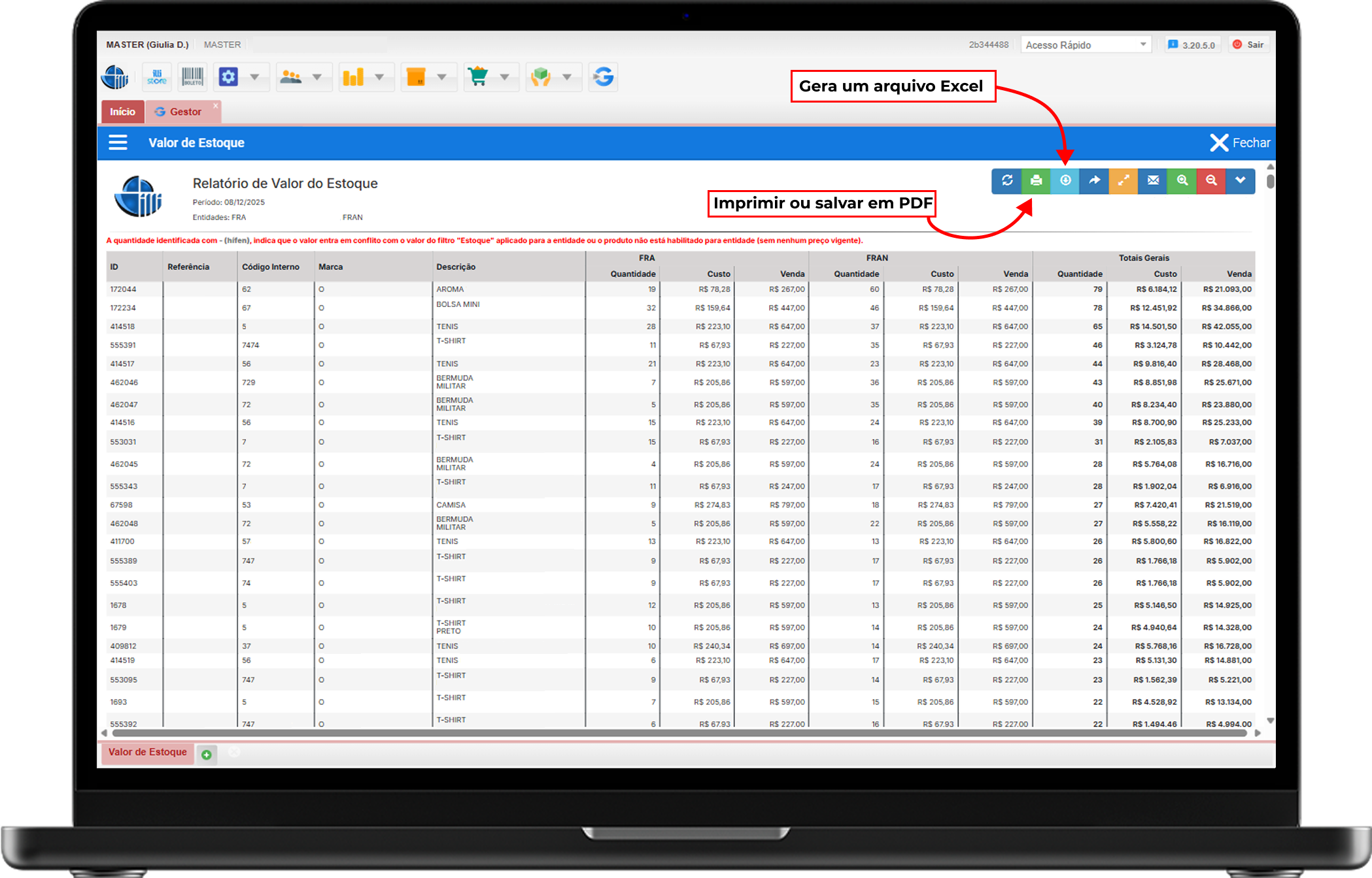 - Detalhe Importante: Selecione a loja desejada para garantir que os dados de estoque sejam restritos a essa unidade.
