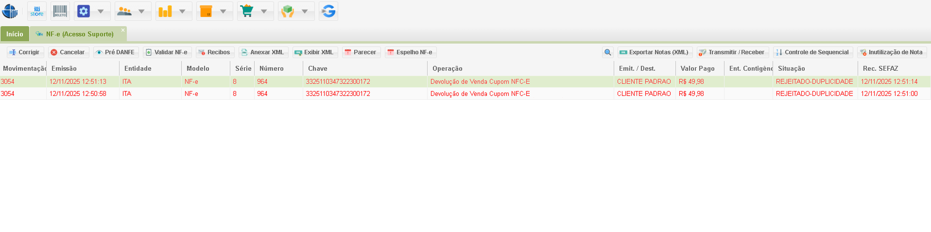 Este manual é um guia operacional para a equipe de suporte, focado na identificação e correção das inconsistências mais comuns em Notas Fiscais eletrônicas (NF-e / NFC-e) emitidas no sistema, abrangendo situações de: Duplicidade, Contingência, Transmitidas sem retorno, Digitação, Rejeitadas.