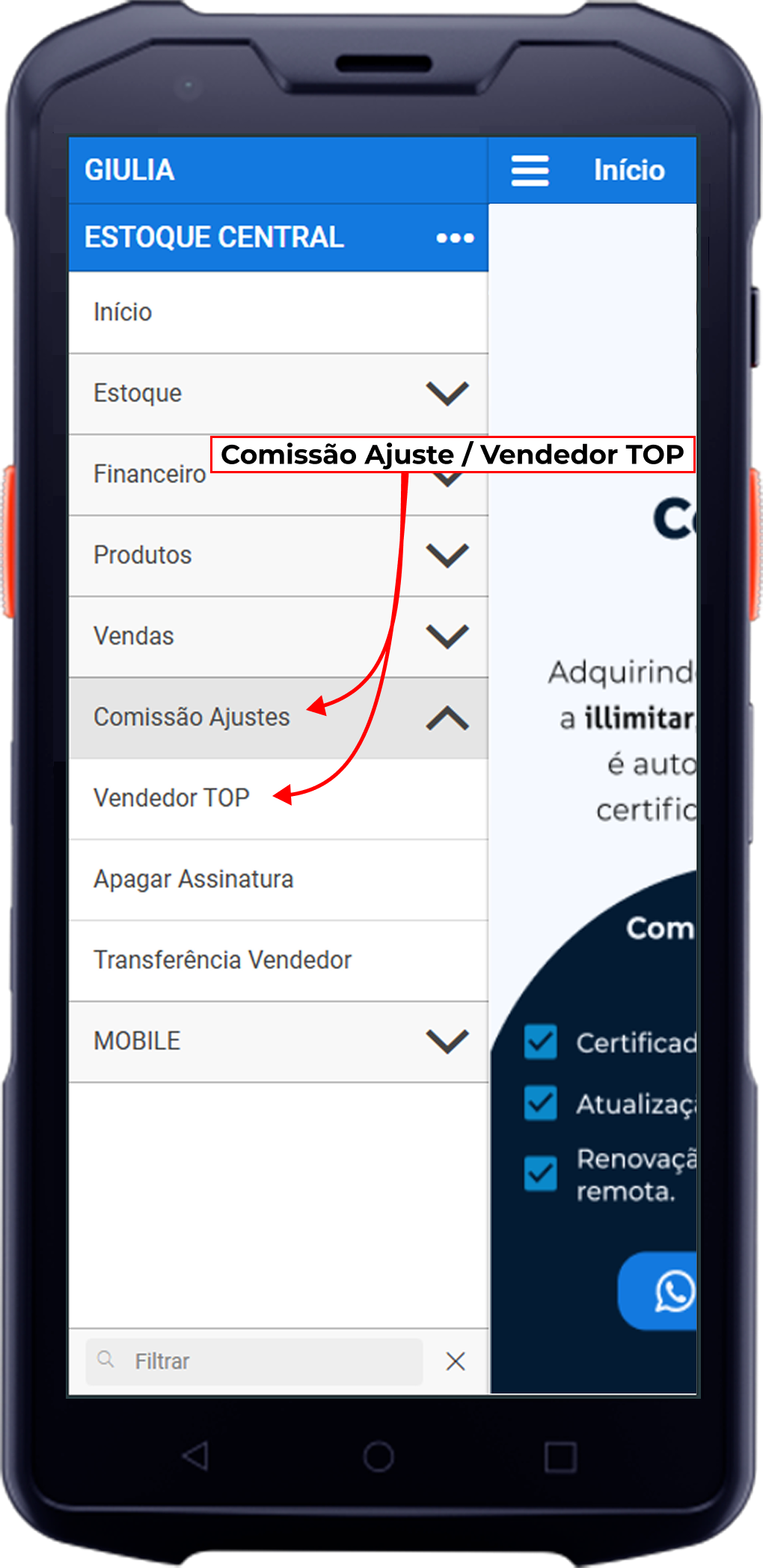 - Análise: O gerente acessa o Gestor > Comissão Ajuste e abre o App Vendedor Top.