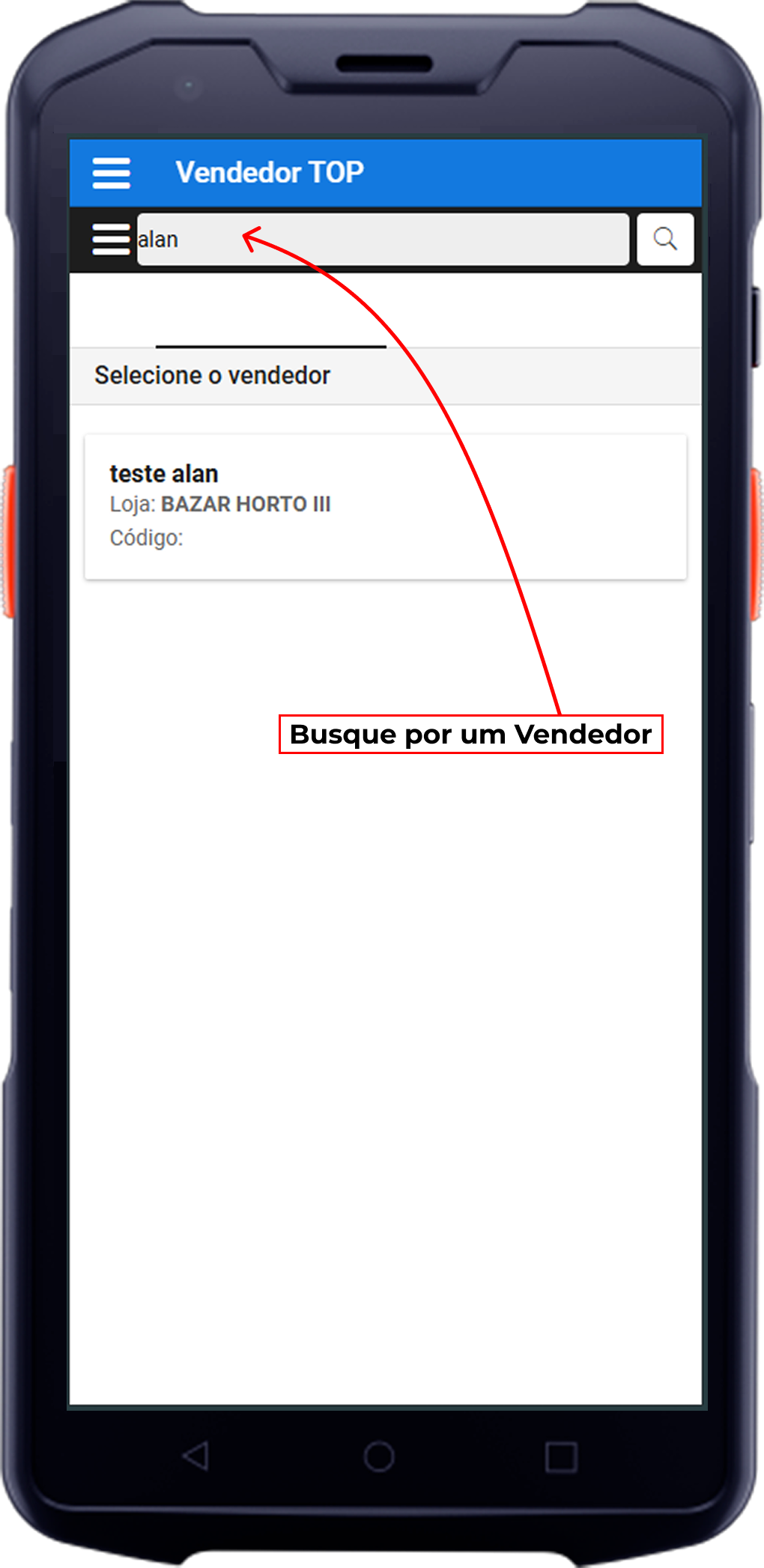 - Utilize o campo de busca para digitar o nome do Vendedor (ou cliente/vendedor, conforme o cadastro).