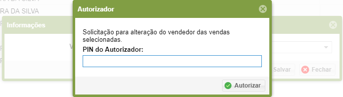 - Após selecionar o vendedor, clique em “Salvar”. O sistema solicitará um PIN. Informe o PIN do responsável autorizado e clique em autorizar.