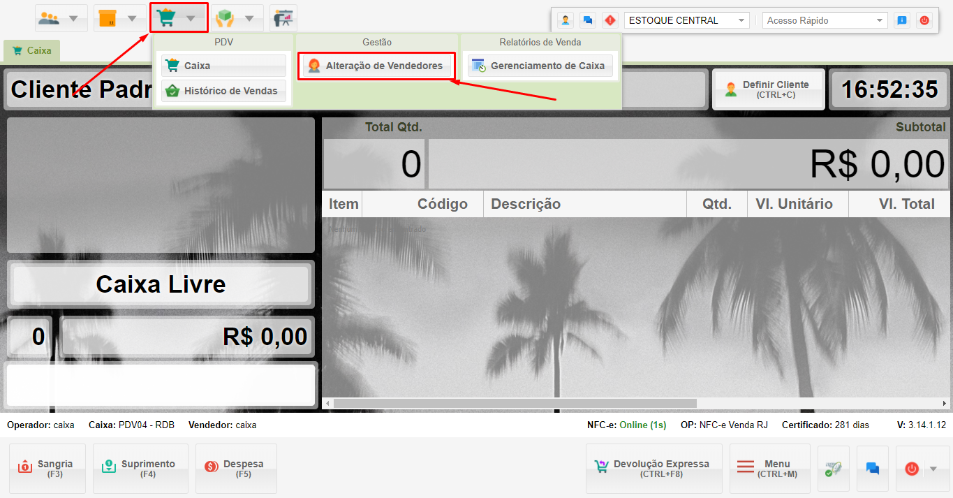 Após finalizar uma venda, você pode alterar o vendedor registrado. Para isso, acesse o módulo de venda e selecione a opção Alteração de Vendedores.