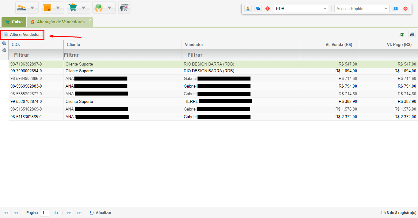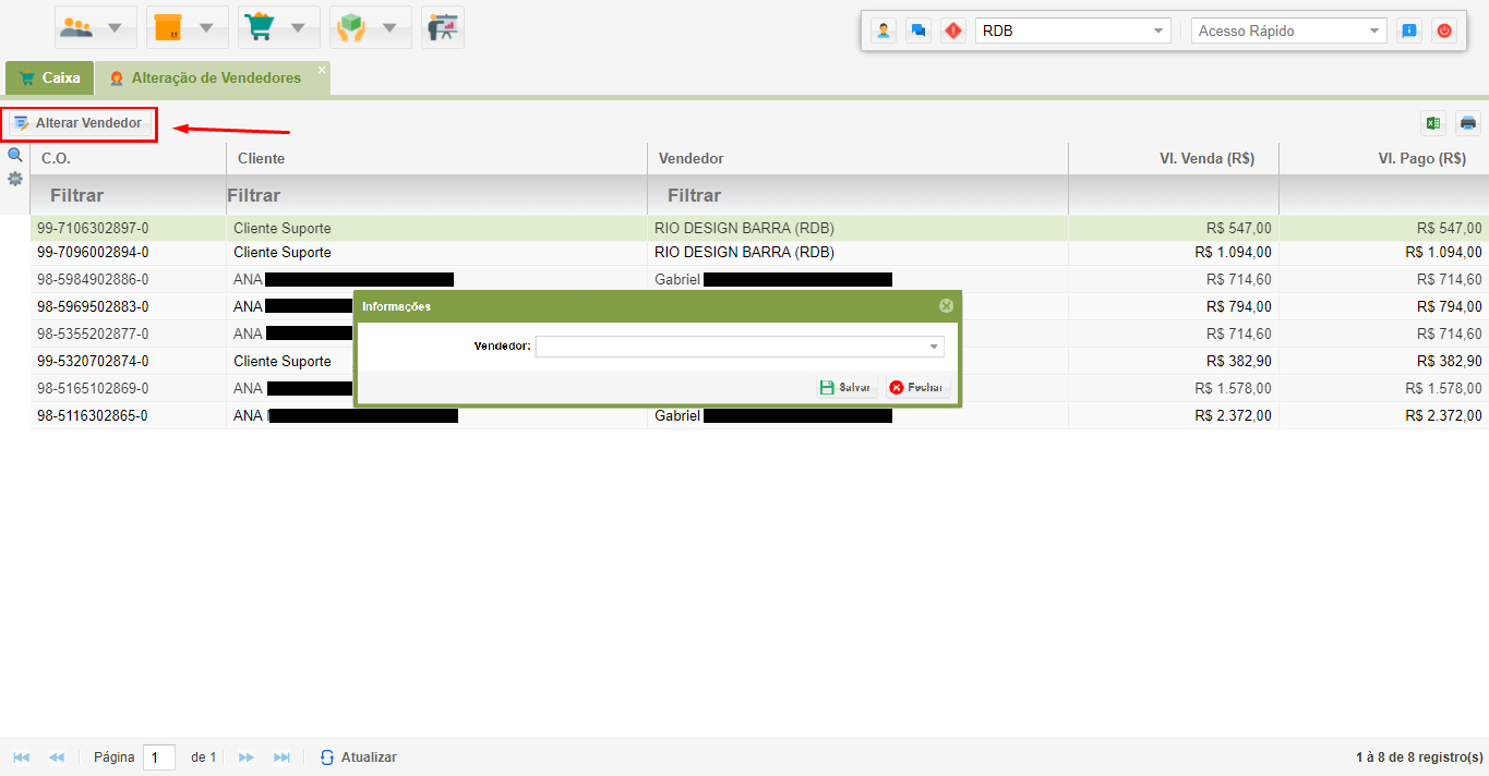 Selecione a venda em questão e clique em “Alterar Vendedor”.