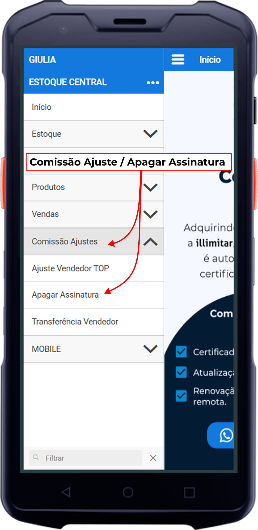 Caminho: Gestor > Menu > Comissão Ajustes > Apagar Assinatura.