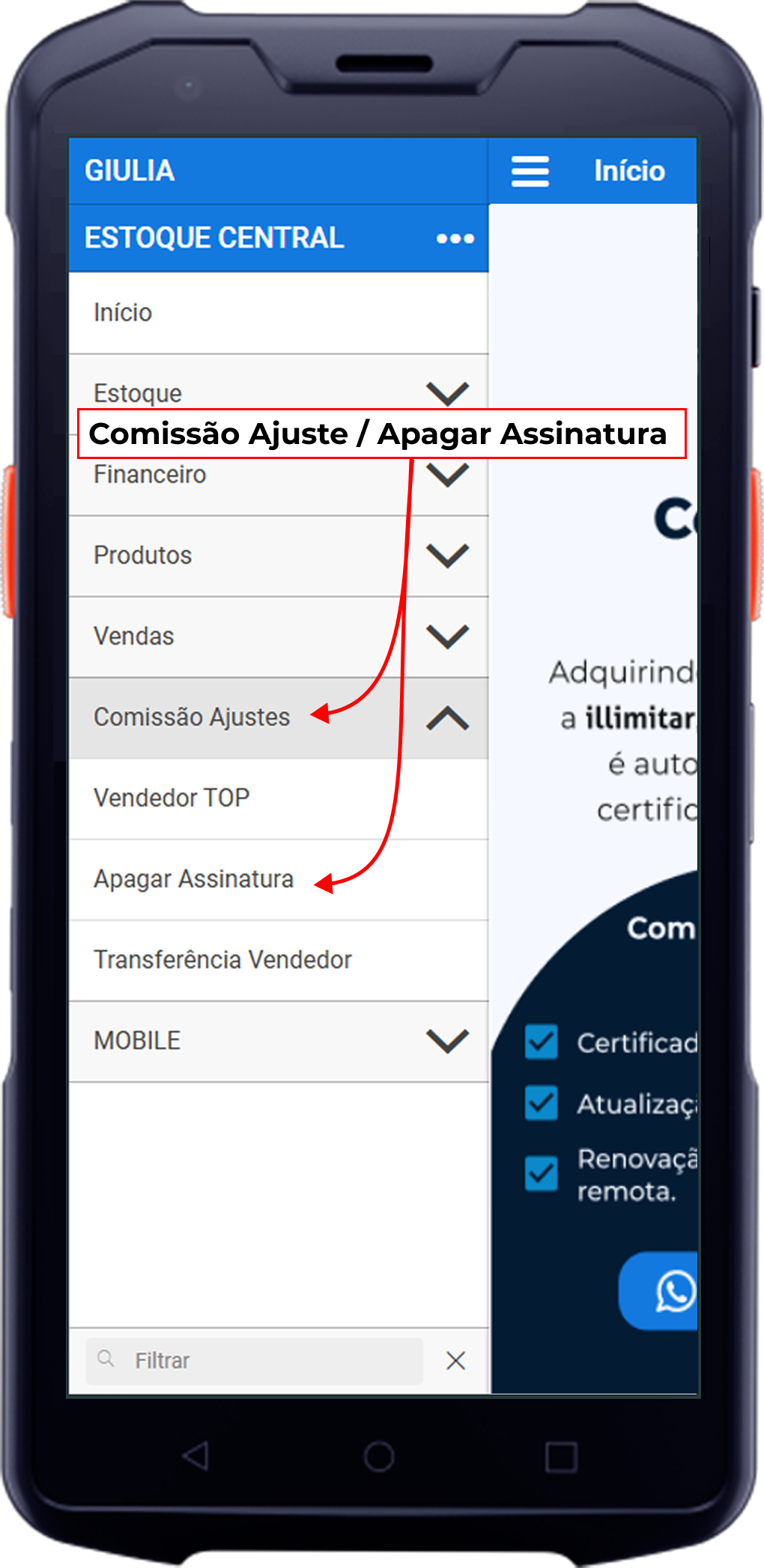 Caminho: Gestor > Menu > Comissão Ajustes > Apagar Assinatura.