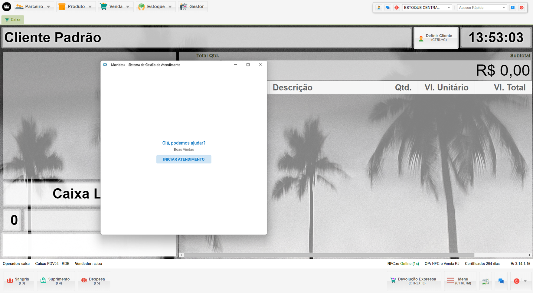 Quase todos os botões do sistema possuem atalhos para facilitar e agilizar o trabalho do usuário. Na tela inicial, você encontrará alguns botões fixos e outros que mudam dependendo se há ou não um produto adicionado ao carrinho.