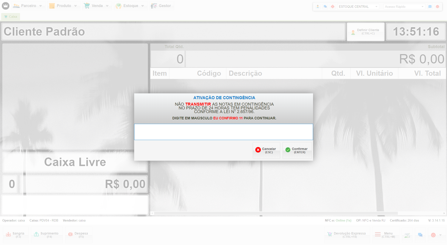 Contingência NFC-e (CTRL + SHIFT + F9)