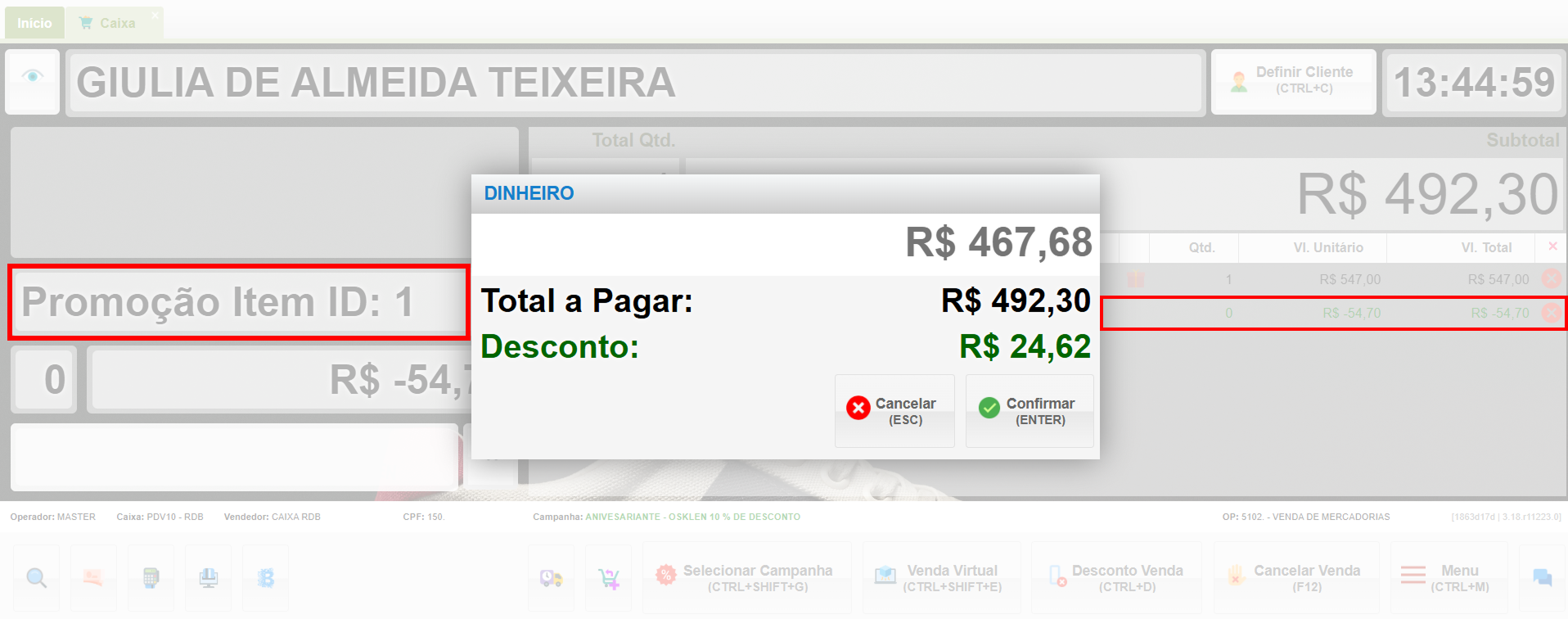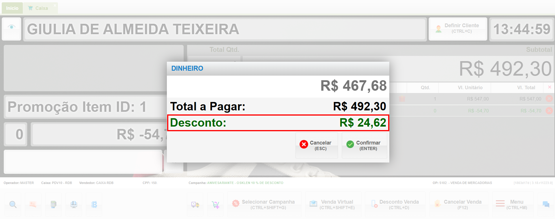 Nesse caso, mesmo com a campanha selecionada, a forma de pagamento oferece um desconto de 5%. Confirme.