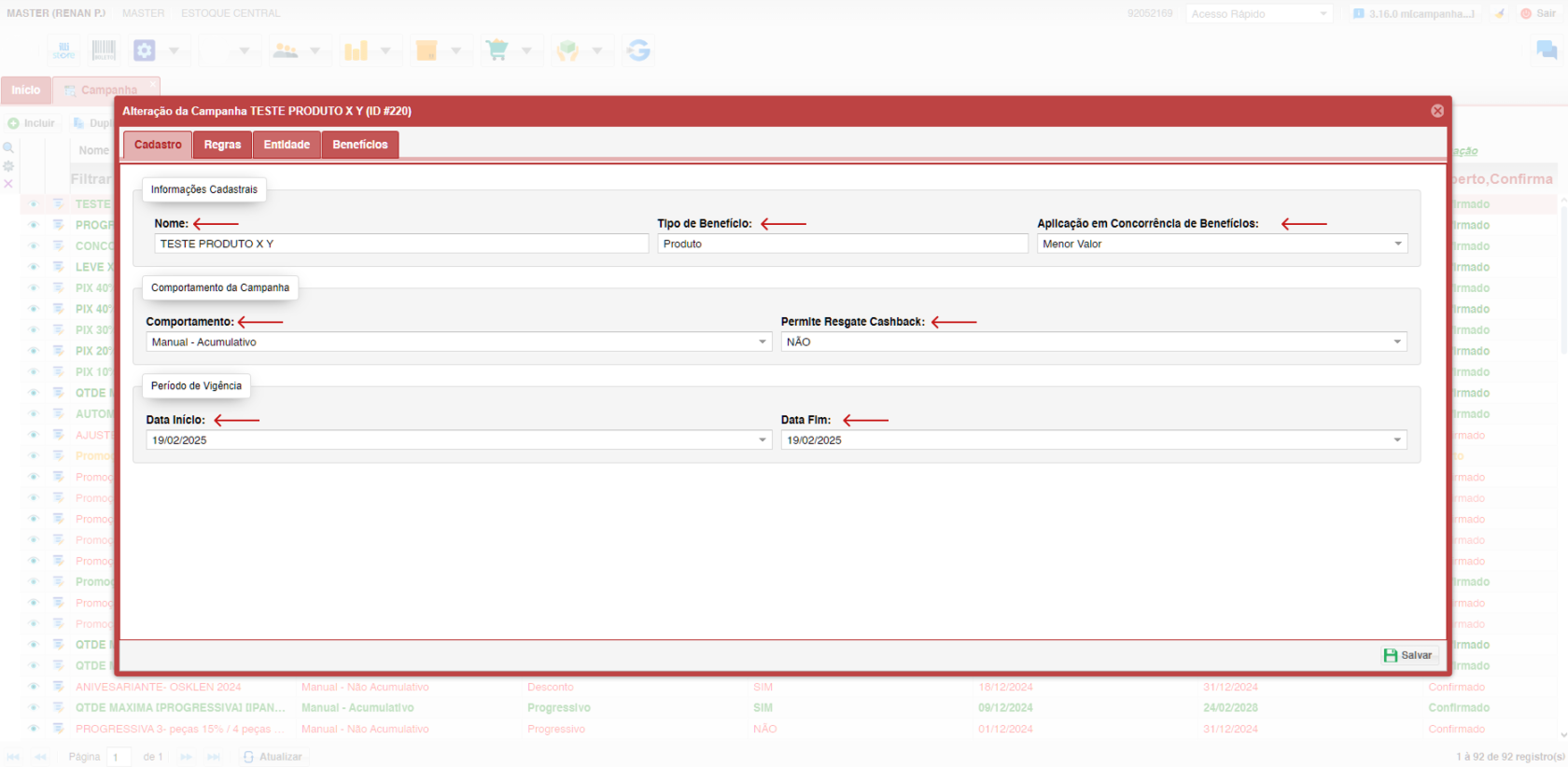 - Data Início e Data Fim: Define o período de vigência da campanha.