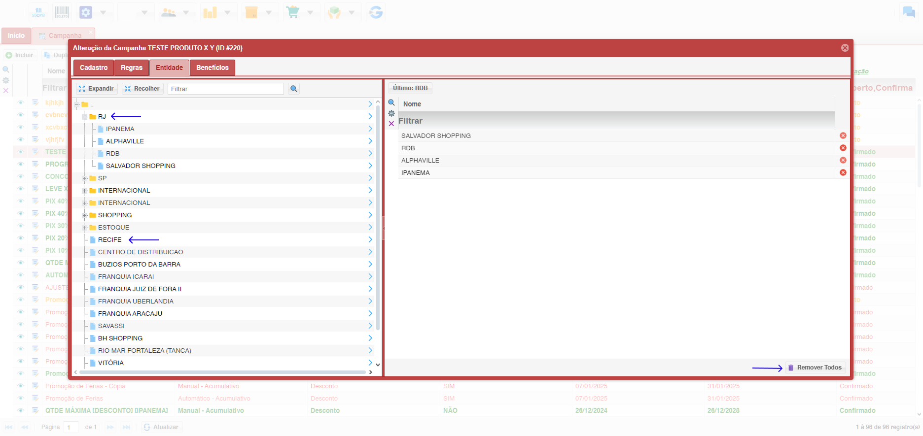 - Utilize o botão Remover Todos para remover todas as entidades selecionadas de uma vez.