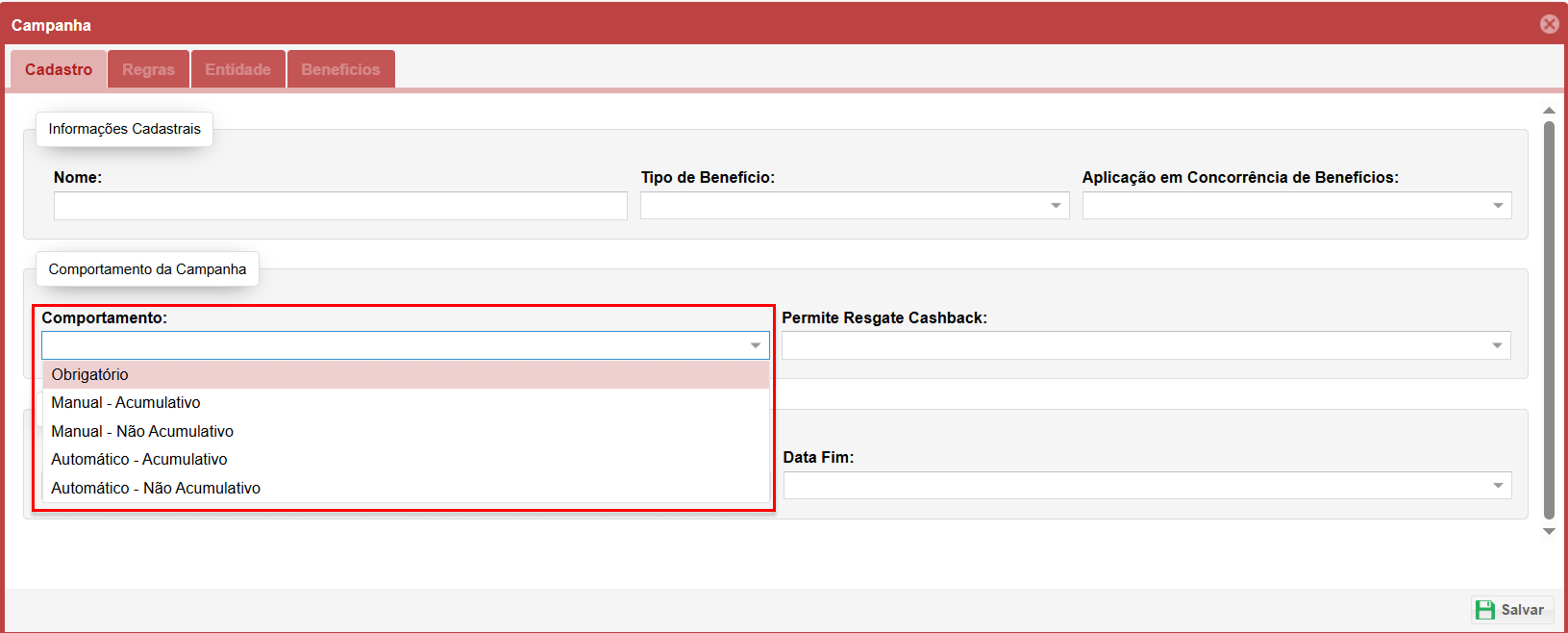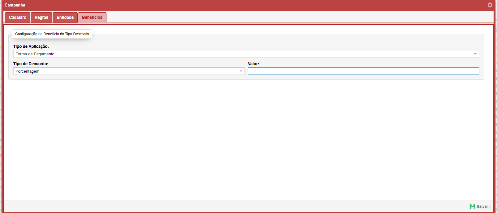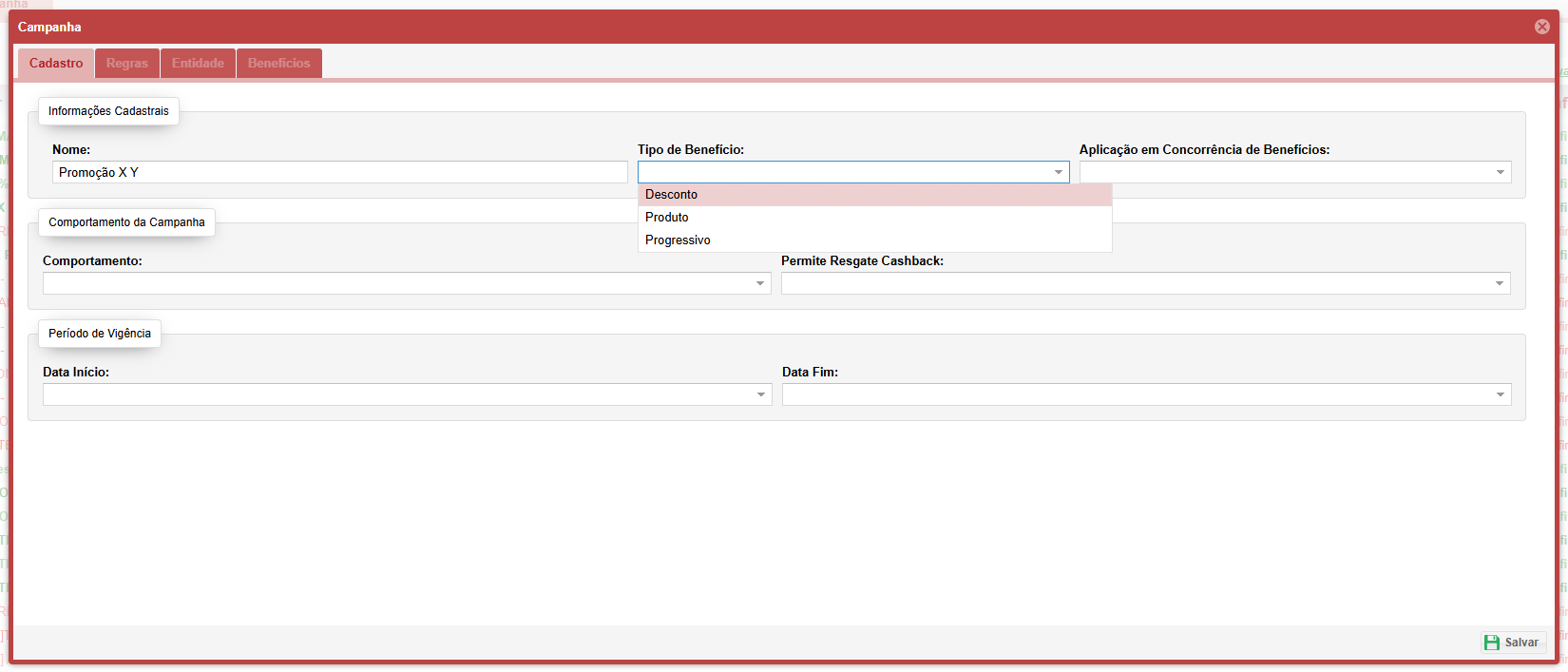 Na aba de Benefícios, você configura os detalhes do benefício que será oferecido na campanha. Os campos disponíveis variam de acordo com o "Tipo de Benefício" selecionado na aba Cadastro.