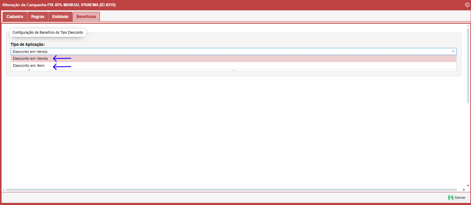 Se o "Tipo de Benefício" for Desconto e o comportamento for como obrigatório, o "Tipo de aplicação" ficará como "Forma de pagamento"