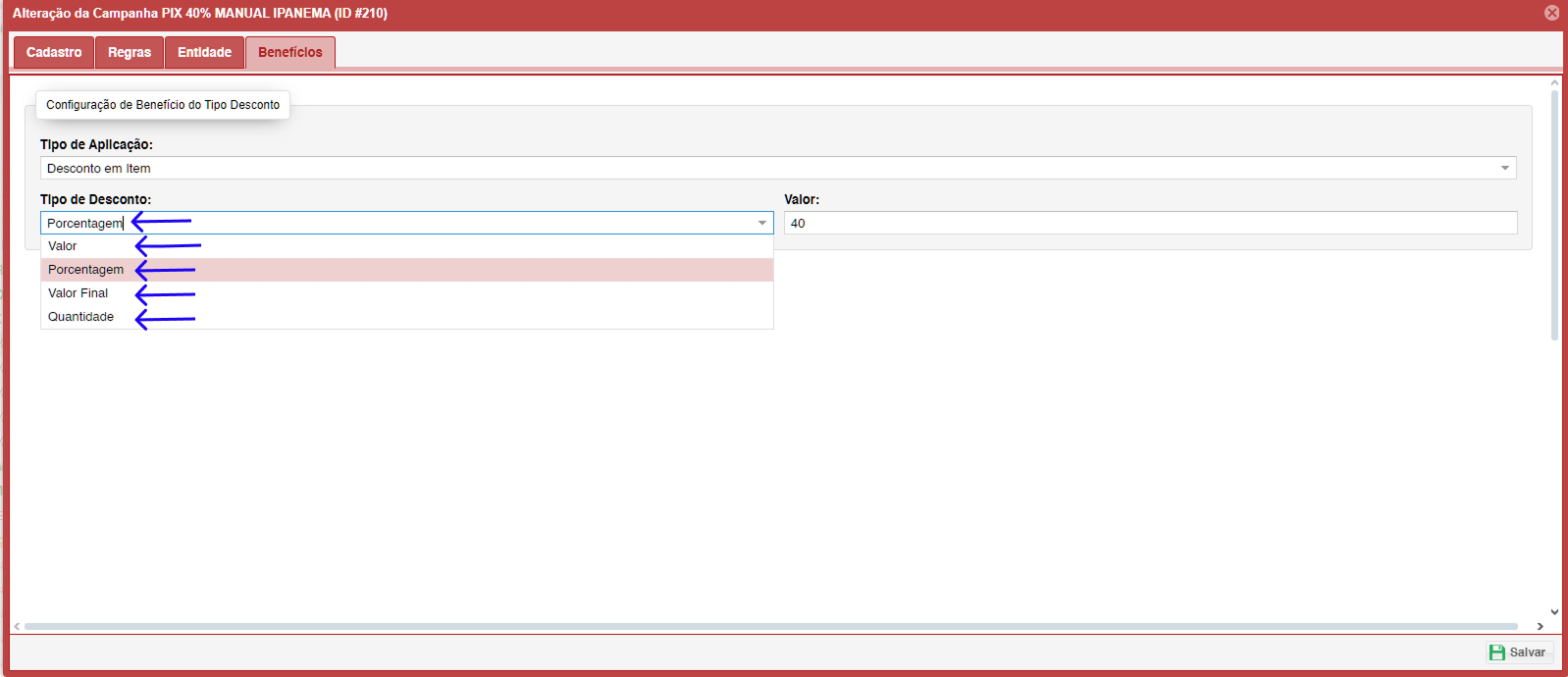 - A única opção disponível para "Tipo de Desconto" é "Porcentagem".