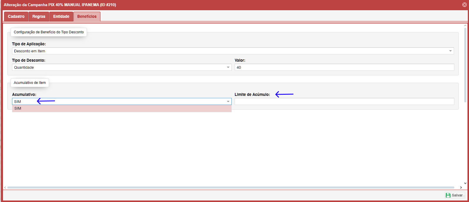 - Se marcado como acumulativo, um novo campo Limite de Acúmulo será exibido, permitindo definir quantas vezes o benefício pode ser acumulado.