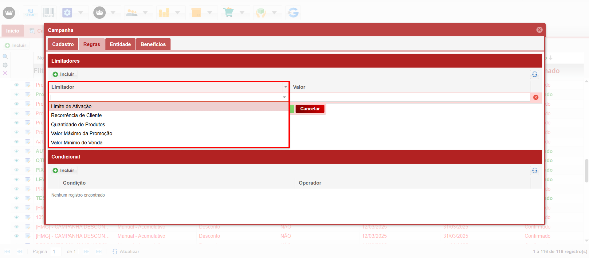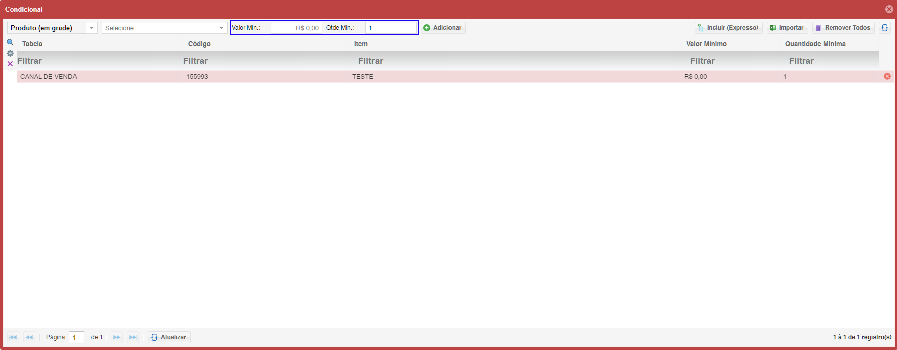 - Incluir (Expresso): Abre uma tela para filtrar e incluir itens em massa na lista de condicional.