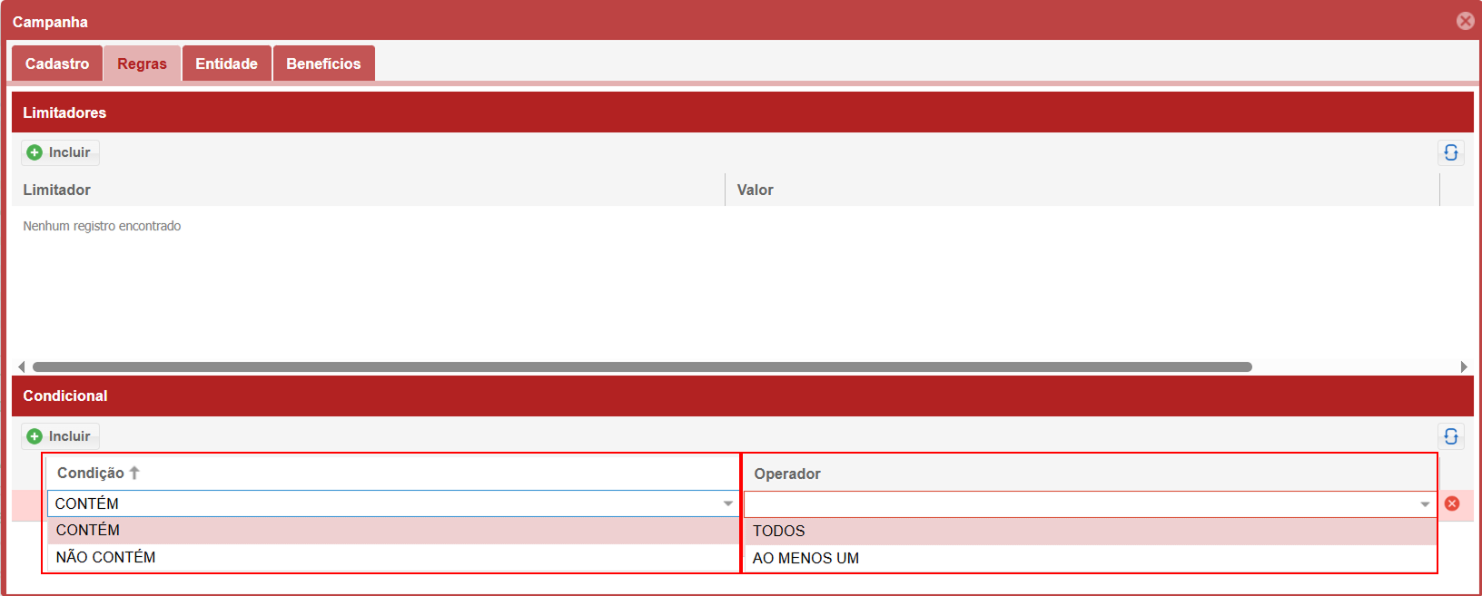 - Se a Condição for "Não Contém" e o Operador for "Todos", nenhum dos itens especificados poderá estar presente na venda para que a campanha seja aplicada.
