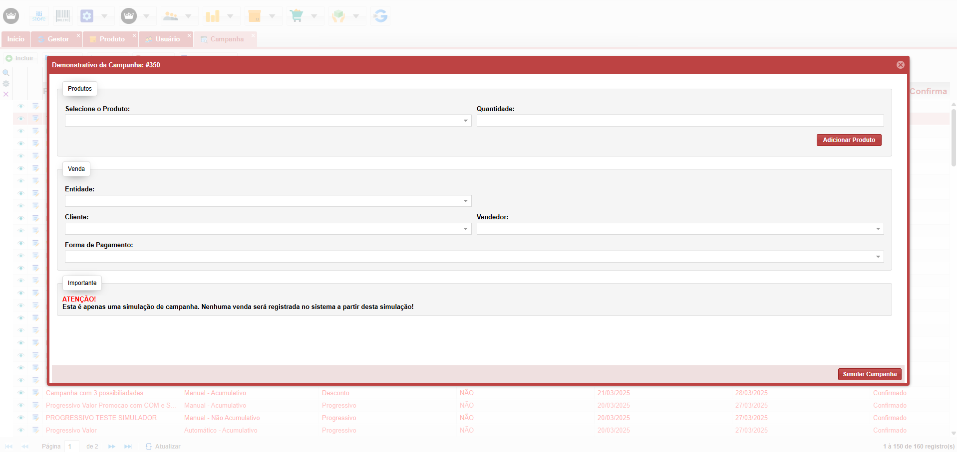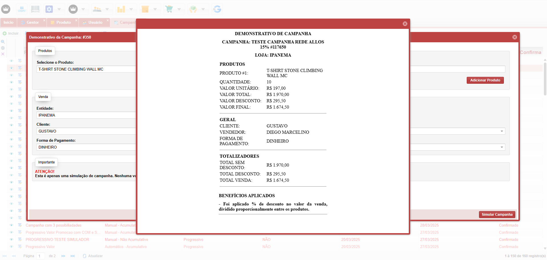 - Demonstrativo: Consegue simular o uso de uma campanha ativa, sem ficar com uma venda registrada.