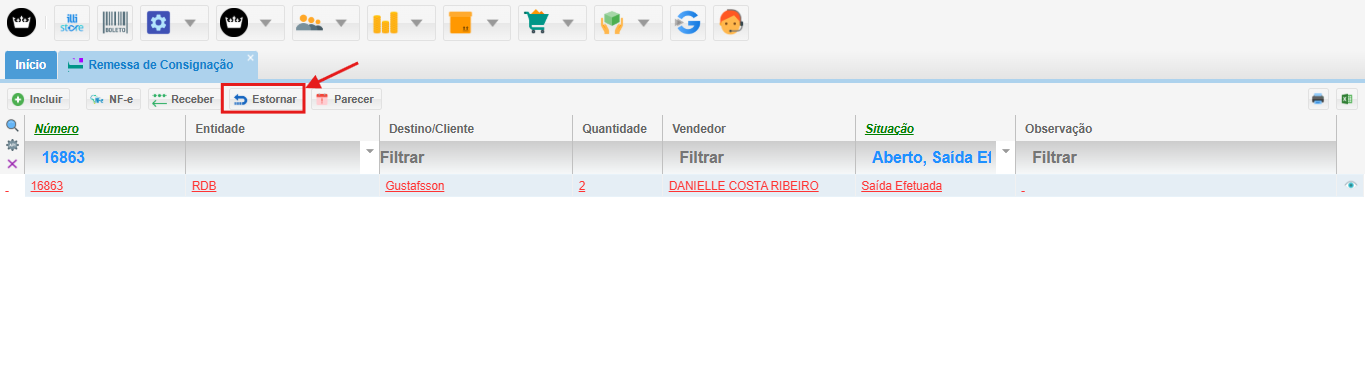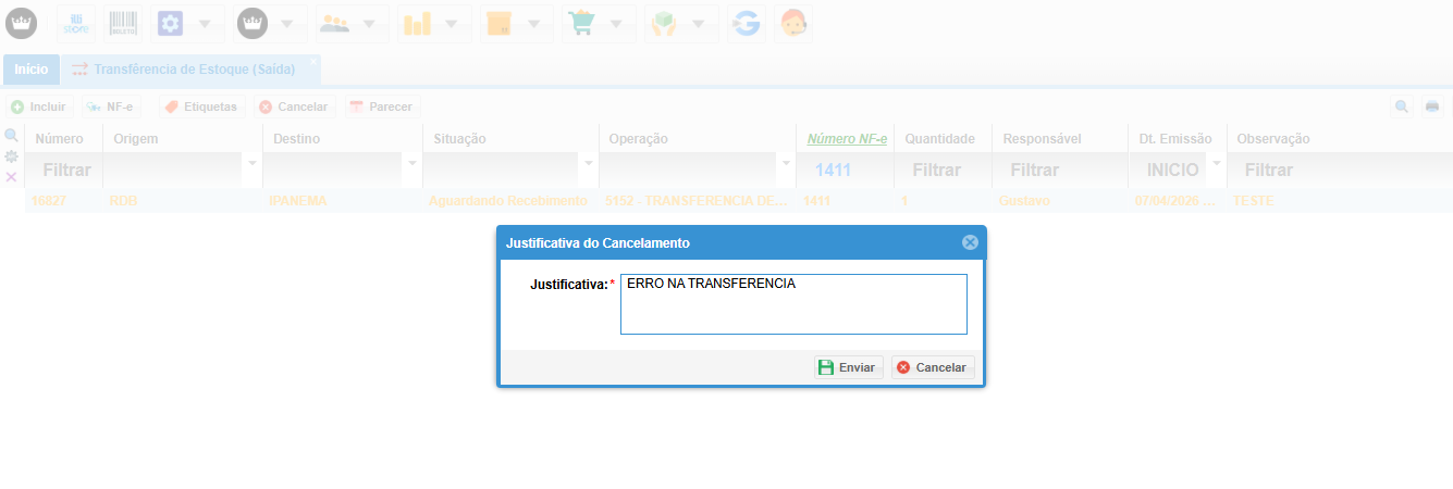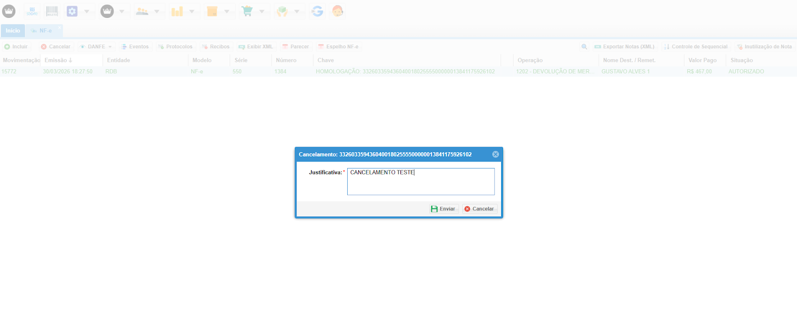 - Automaticamente ao selecionar a remessa e Estornar, vai iniciar o processo de cancelamento da nota. Só seguir com o fluxo de cancelamento informando a justificativa.