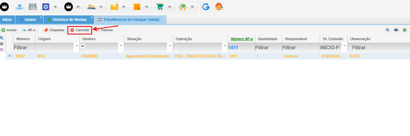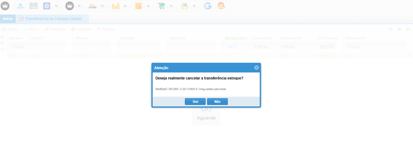 Automaticamente ao selecionar a transferência e cancelar, vai realizar o processo de cancelamento da nota.