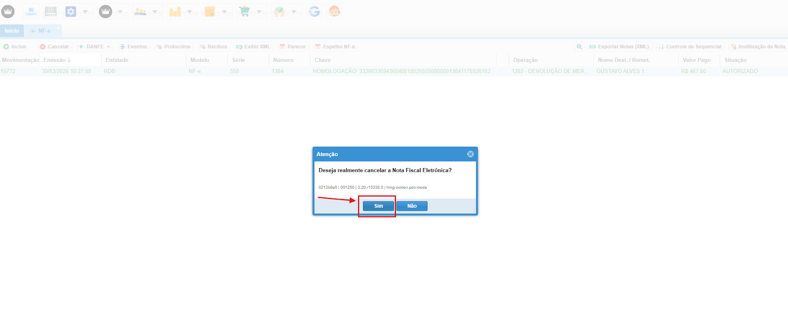 Aparecerá a confirmação para fazer o cancelamento, clique em Sim