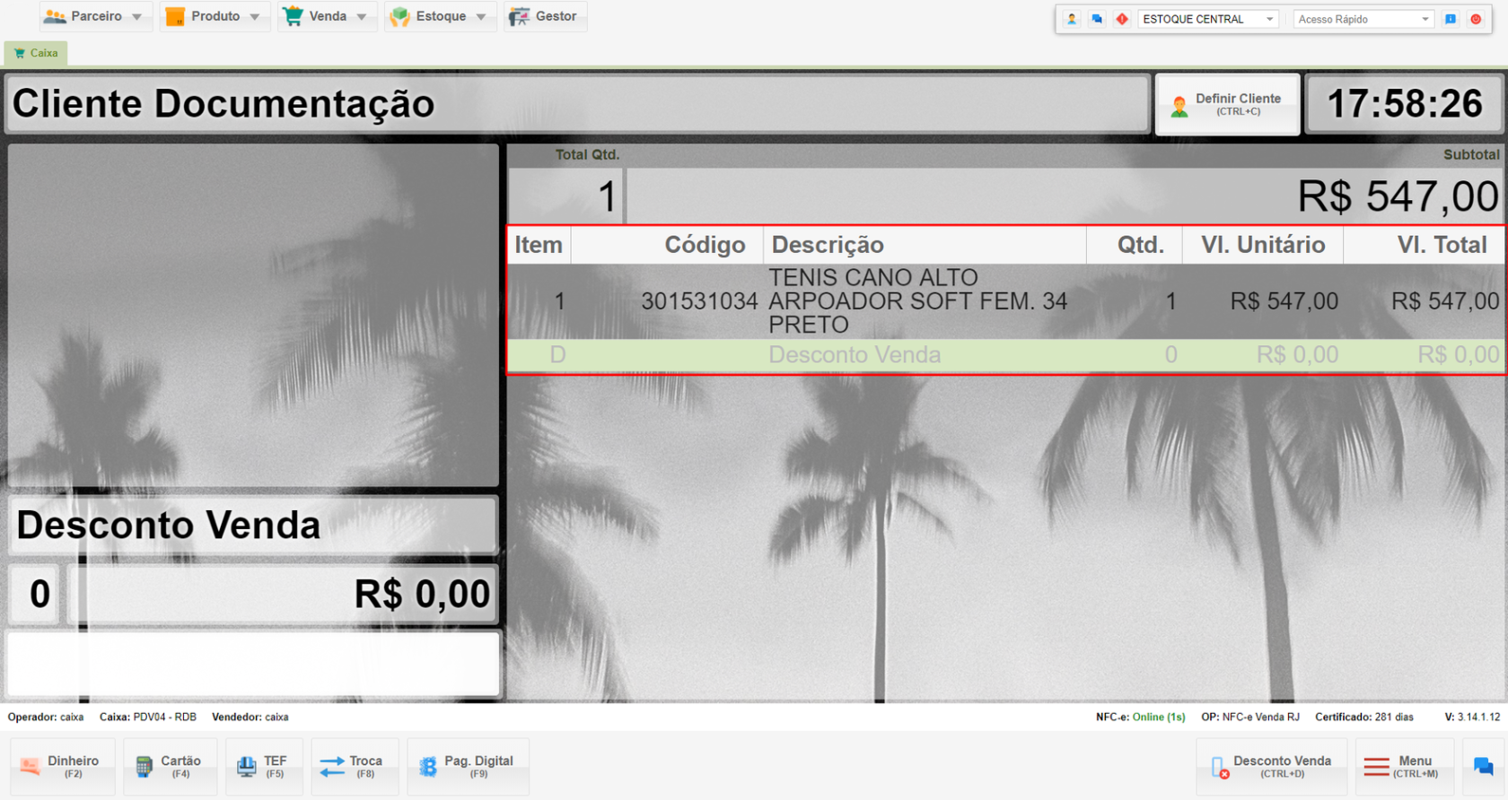 - Para ativar o desconto, use o atalho “Ctrl + D” ou clique no botão “Desconto Venda”.