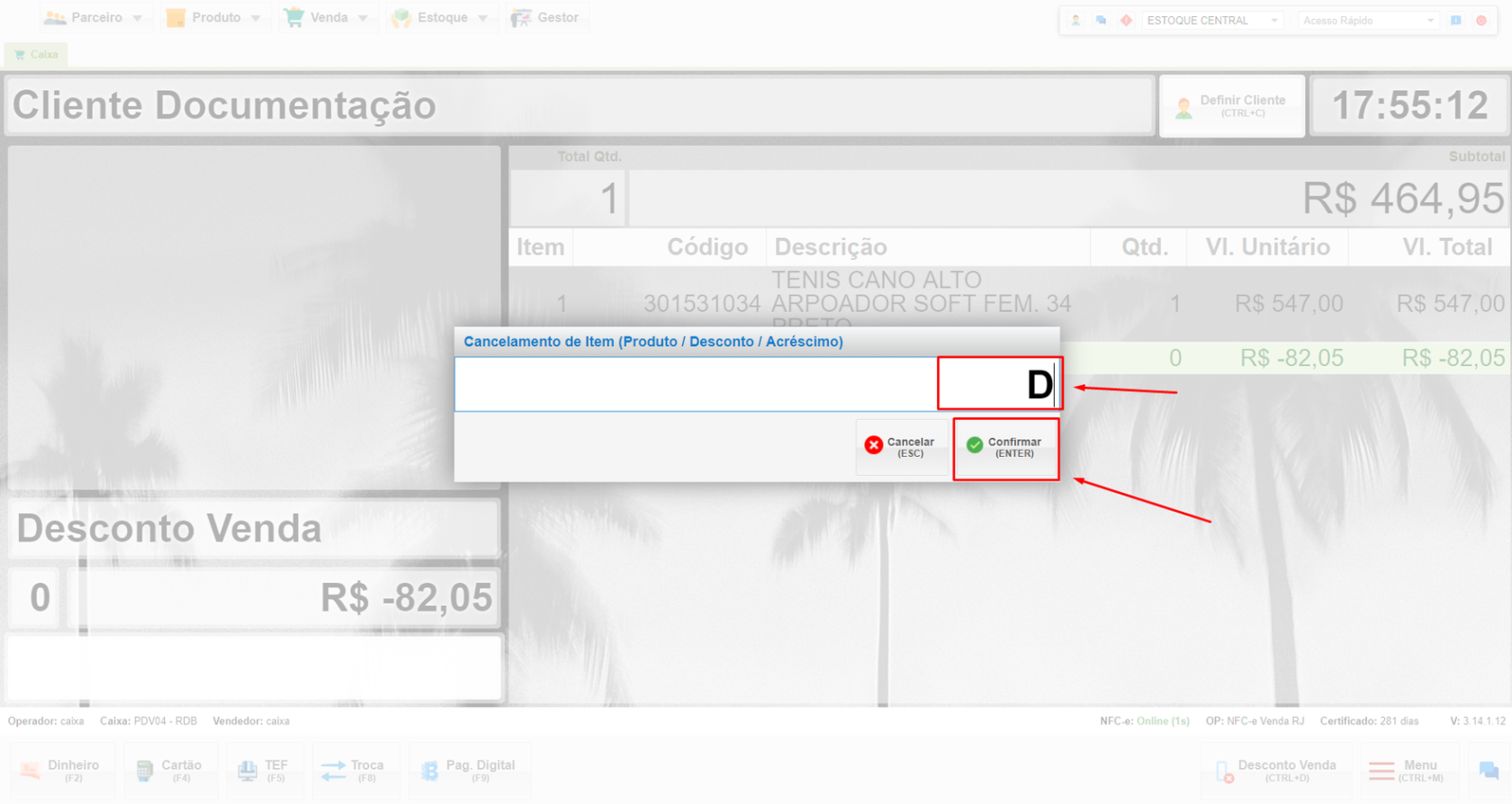 Informe o item relacionado ao desconto (no caso, a tecla “D”) e aperte “Confirmar (ENTER)”.