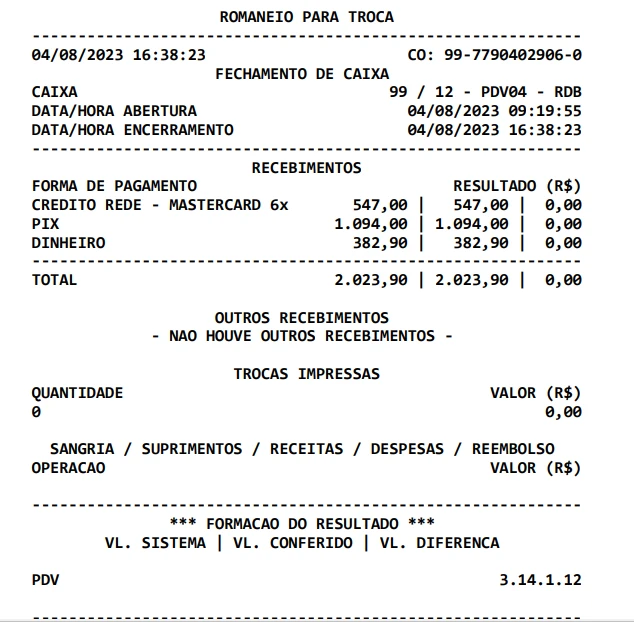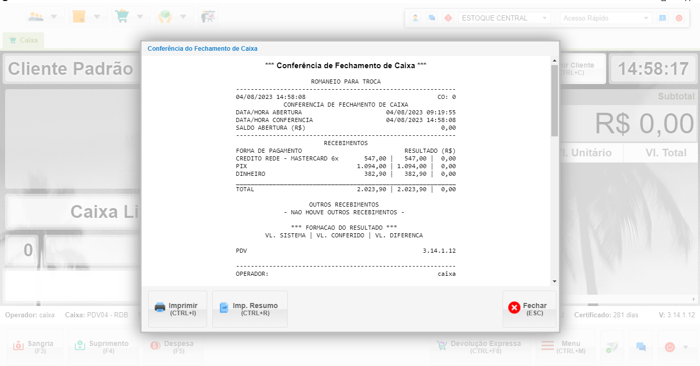 Nota: A impressão do fechamento de caixa exibirá um resumo detalhado das operações realizadas.