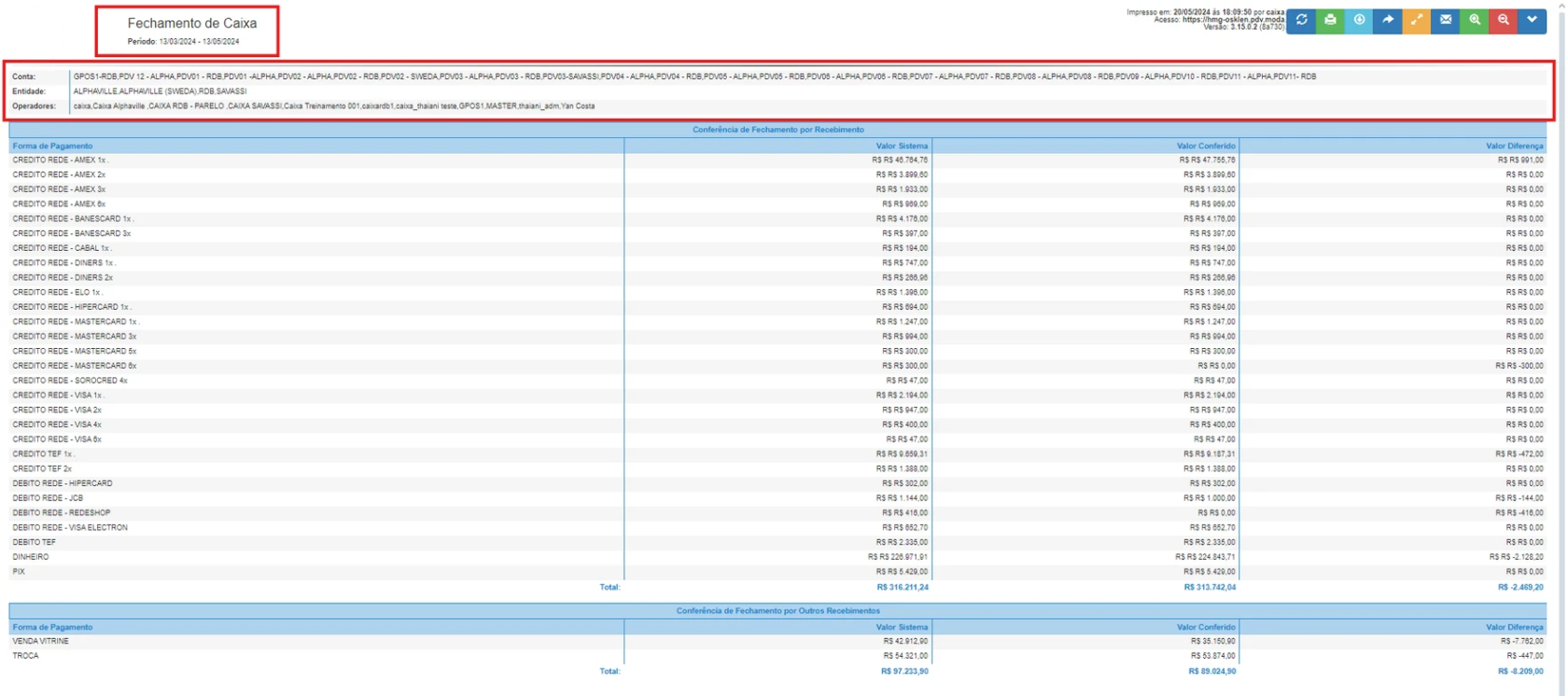 - No relatório gerado, você poderá visualizar o período informado, quais caixas foram abertos e em quais entidades. Use essa informação para monitorar e auditar as operações de fechamento de caixa.