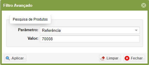 - E no campo “Valor” você deve informar o que deseja Ex: Referencia 70008.