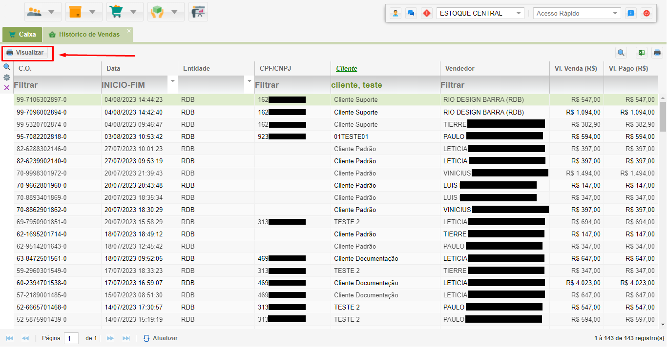 Para visualizar os detalhes de uma venda específica, selecione a venda desejada e clique no botão “Visualizar” no canto superior esquerdo.