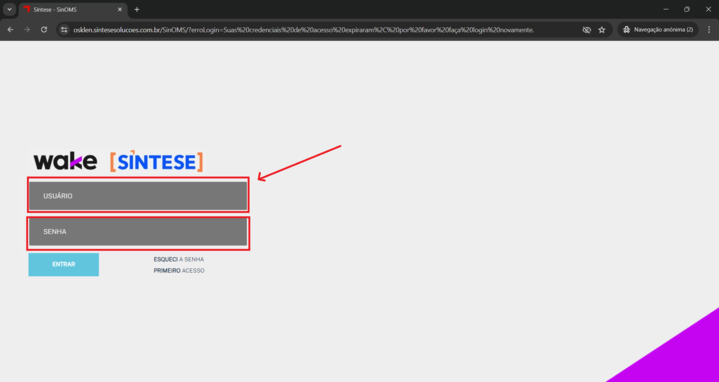 - Faça login nos campos indicados na página inicial.